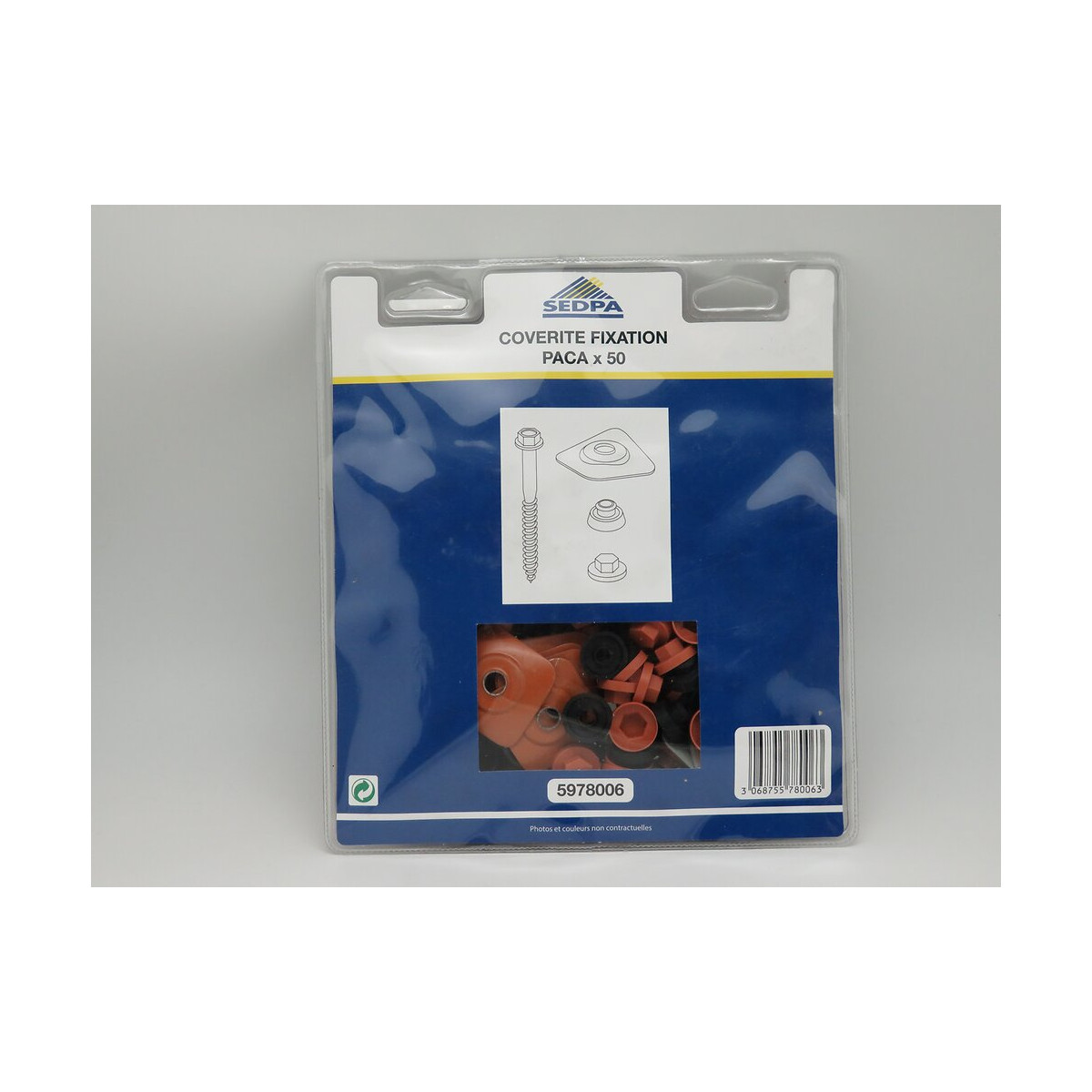 Kit de fixations pour plaques de couverture imitation tuile Coverite. Composé de 50 vis, 50 capuchons, 50 rondelles d'étanchéité, 50 plaquettes. Coloris : Paca antique - Dimensions de la vis : 6 x 80mm.