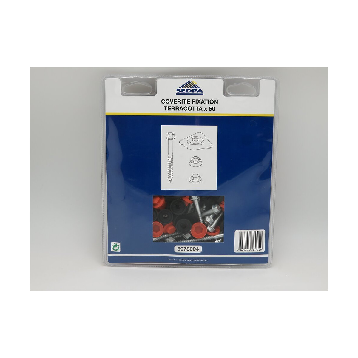 Kit de fixation pour plaque de couverture PVC imitation tuile. Composé de 50 vis, 50 capuchons, 50 rondelles d'étanchéité, 50 plaquettes. Coloris : Terracotta - Dimensions de la vis : 6 x 80mm.