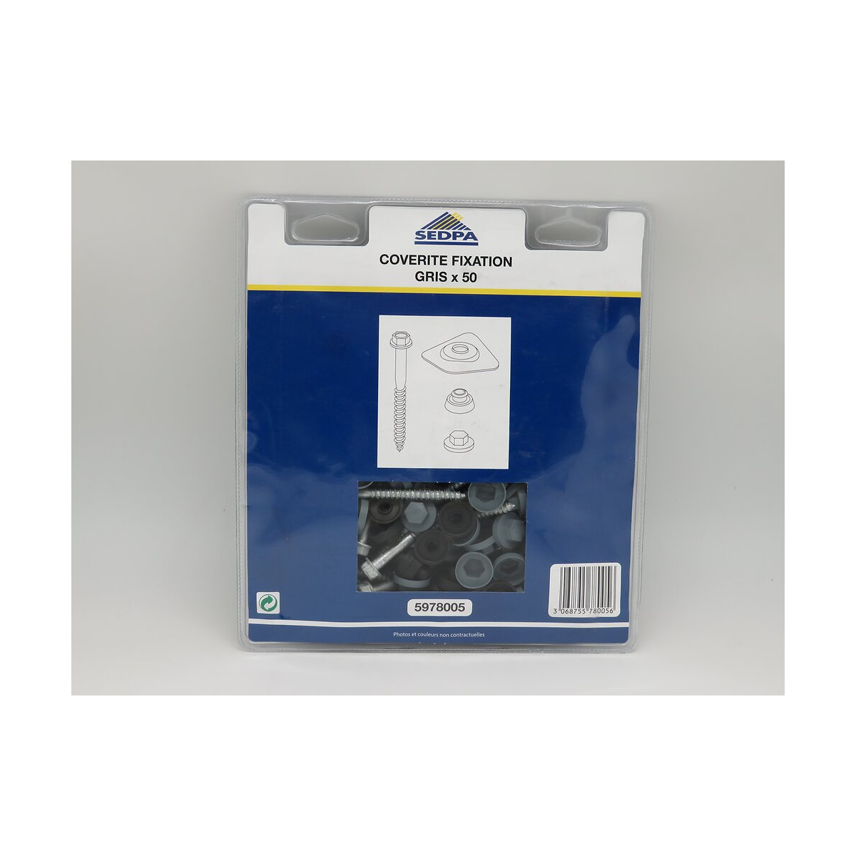 Kit de fixations pour plaques de couverture imitation tuile Coverite. Composé de 50 vis, 50 capuchons, 50 rondelles d'étanchéité, 50 plaquettes. Coloris : gris. Dimensions de la vis : 6 x 80mm.