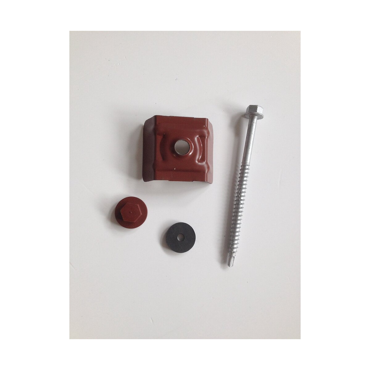 Kit de fixation pour tôle laquée nervurée 1000.45. Coloris : rouge ral 8012. Sachet de 50 pièces : 50 cavaliers, 50 capuchons étanches, 50 rondelles néoprène et 50 vis gachaud.