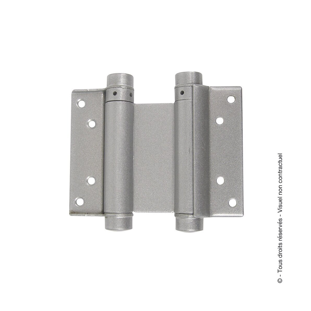 Charnière ressort double action - H100 mm - gris. Fermeture automatique - grand modèle. Largeur de porte = 70 cm. Tension réglable.