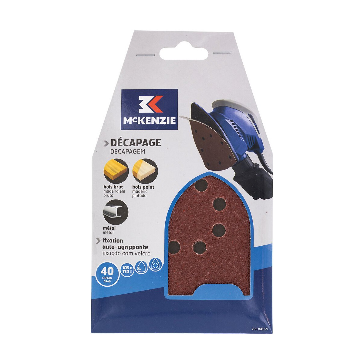Patin auto agrippant delta, papier renforcé corindon 105x170, grain 40, 8 trous pour ponceuse delta, pour bois / peintures / vernis / métaux pour décapage, par 5.Spécifications techniques