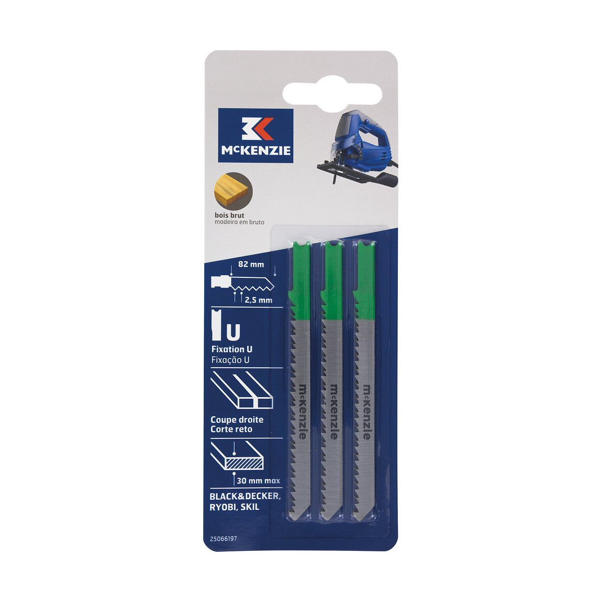 Lame pour scie sauteuse accroche type U chrome vanadium. Longueur : 82mm, largeur des dents : 2,5 mm pour machines : Black & Decker, Ryobi, Skil, profondeur de coupe : 30mm, pour couper le bois, coupe droite, par 3.Spécifications techniques