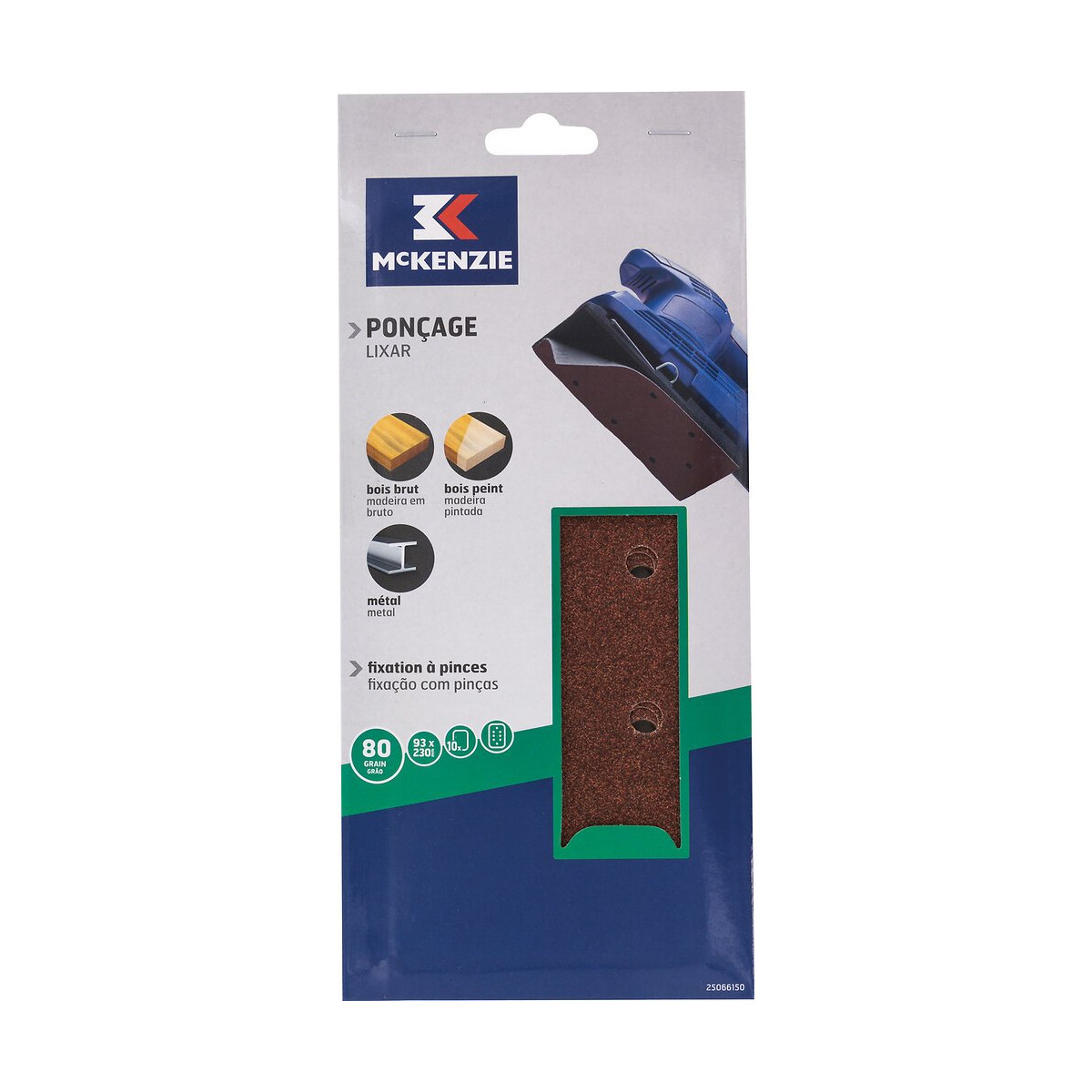 Patins fixation à pinces x10 papier renforcé corindon 93x230, perforés 8 trous, pour ponceuse vibrante, pour bois / peintures / métal / vernis, grain 80 pour ponçage.Spécifications techniques