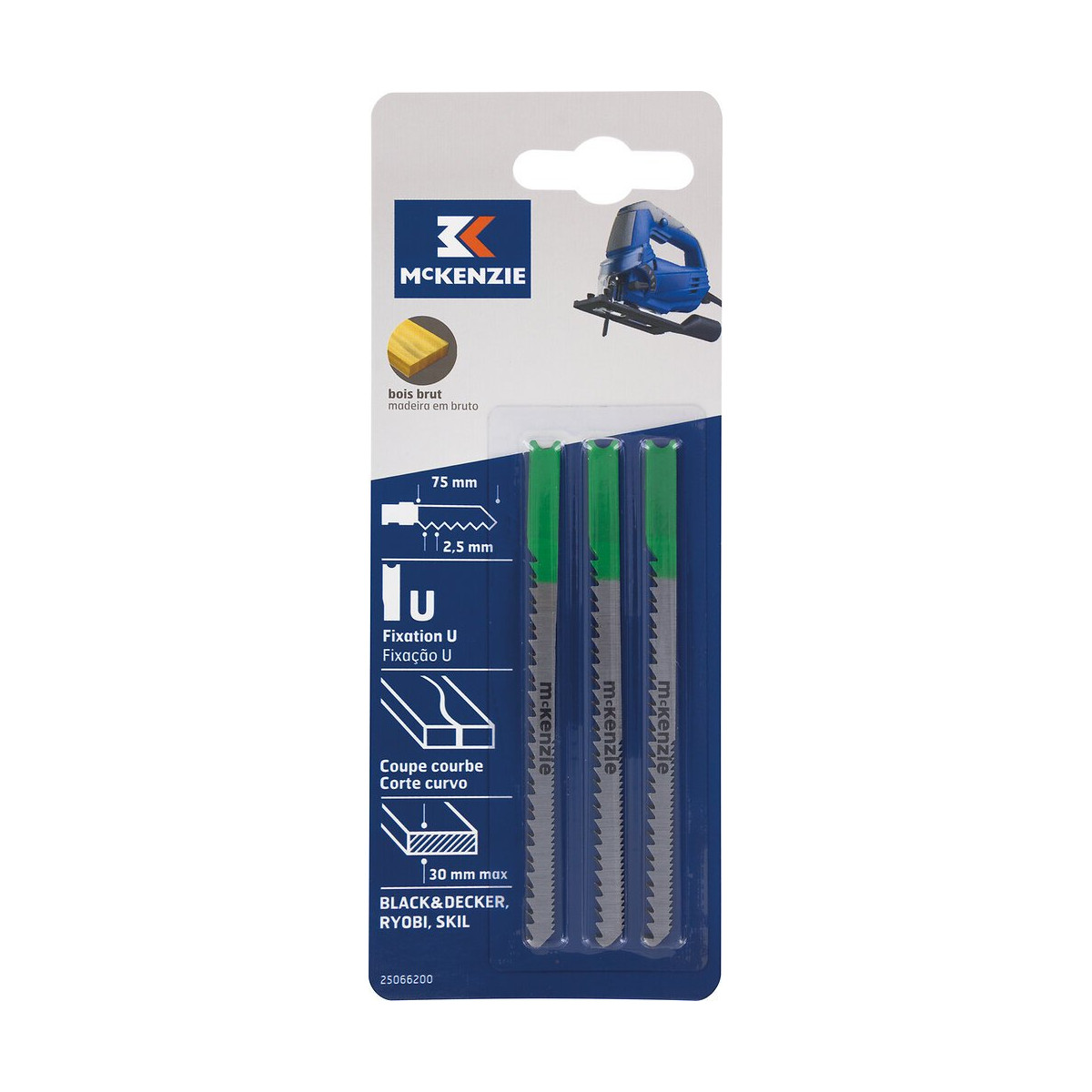 Lame pour scie sauteuse accroche type U chrome vanadium. Longueur : 75mm, largeur des dents : 2,5 mm pour machines : Black & Decker, Ryobi, Skil, profondeur de coupe : 30mm, pour bois brut, coupe courbe, par 3.Spécifications techniques