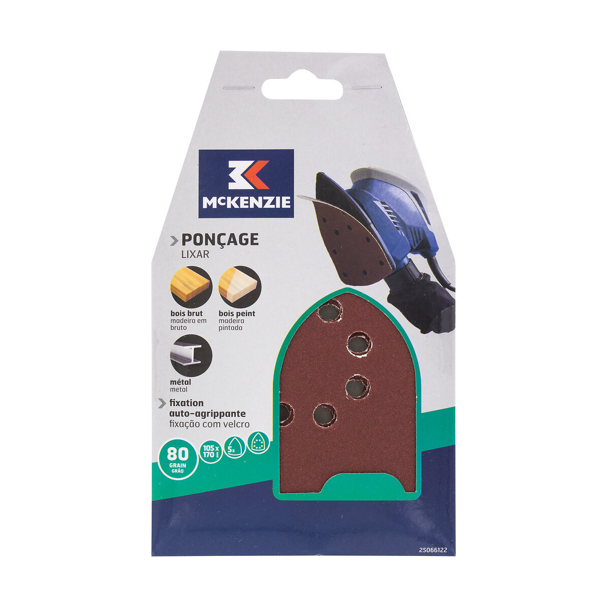 Patins auto agrippant delta, papier renforcé corindon 105x170, grain 80, 8 trous pour ponceuse delta, pour bois / peintures / vernis / métaux pour ponçage, par 5.Spécifications techniques