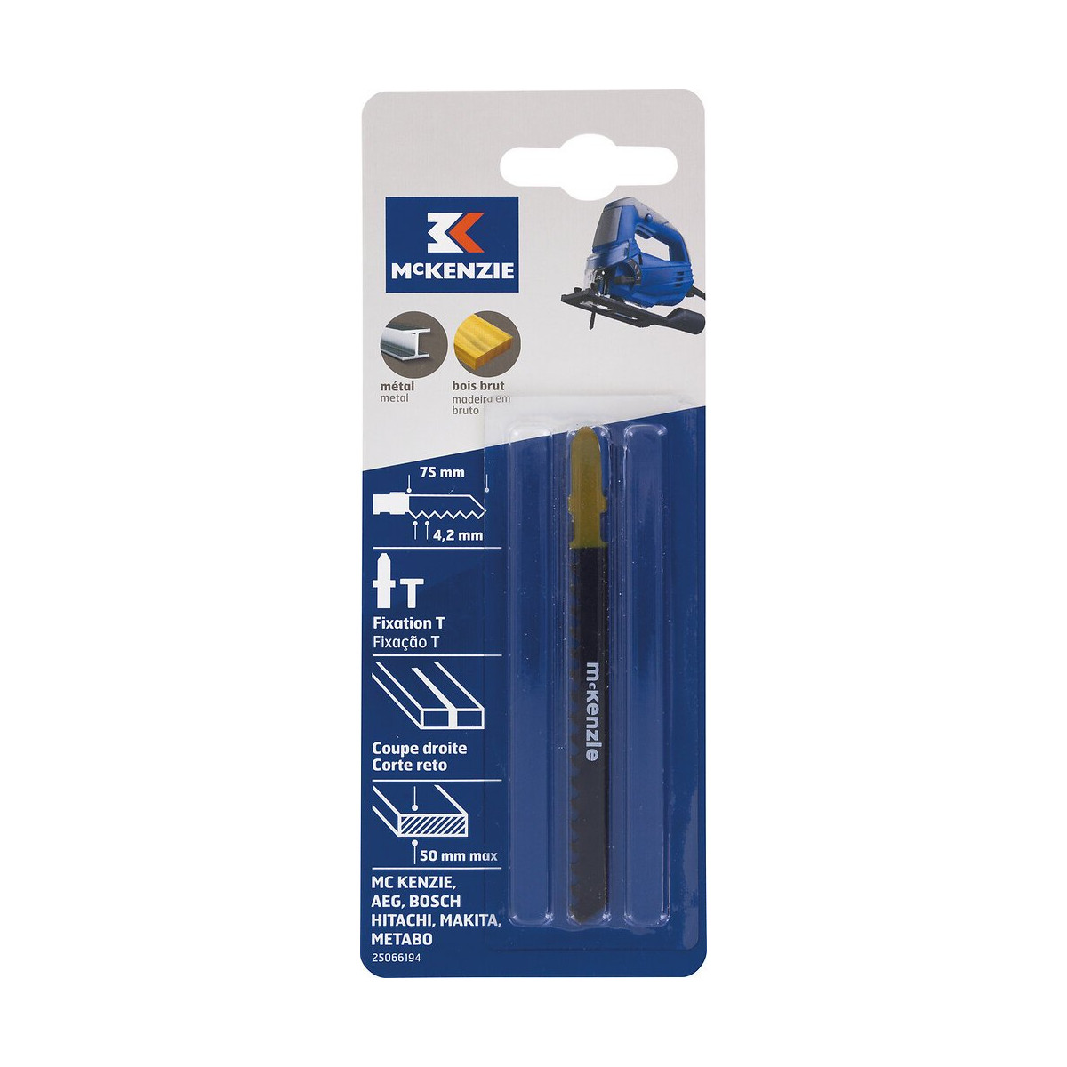 Lame pour scie sauteuse accroche type T, carbure. Longueur : 75mm Largeur des dents : 4,2 mm pour machines : AEG, BOSCH, HITACHI, MC KENZIE, MAKITA, METABO, profondeur de coupe 50mm, coupe droite, par 1.Spécifications techniques