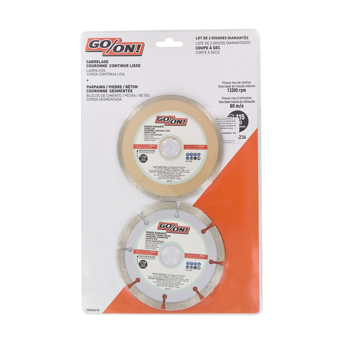 2 Disques diamants couronne continu lisse pour carrelage/céramique et segmenté pour béton, pierre, parpaing, D.115mm x2, alésage 22,2mm coupe à sec, pénétration rapide et sans éclats, RPM maxi 13300.Spécifications techniques