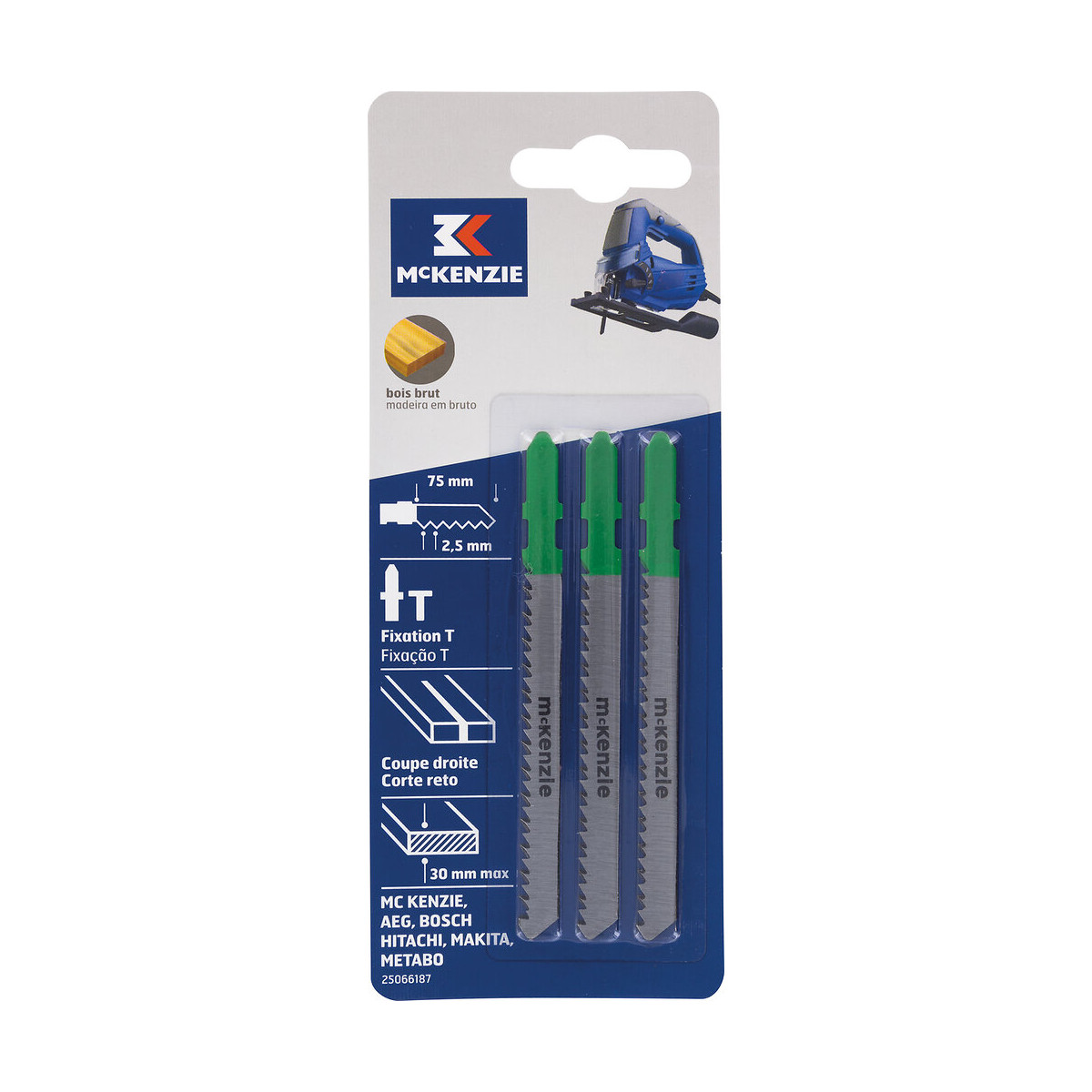 Lame pour scie sauteuse accroche type T en chrome vanadium pour couper le bois. Longueur : 75mm, largeur des dents : 2,5mm pour machines : AEG, BOSCH, HITACHI, MC KENZIE, MAKITA, METABO, profondeur de coupe 30mm, coupe droite, par 3.Spécifications techniques
