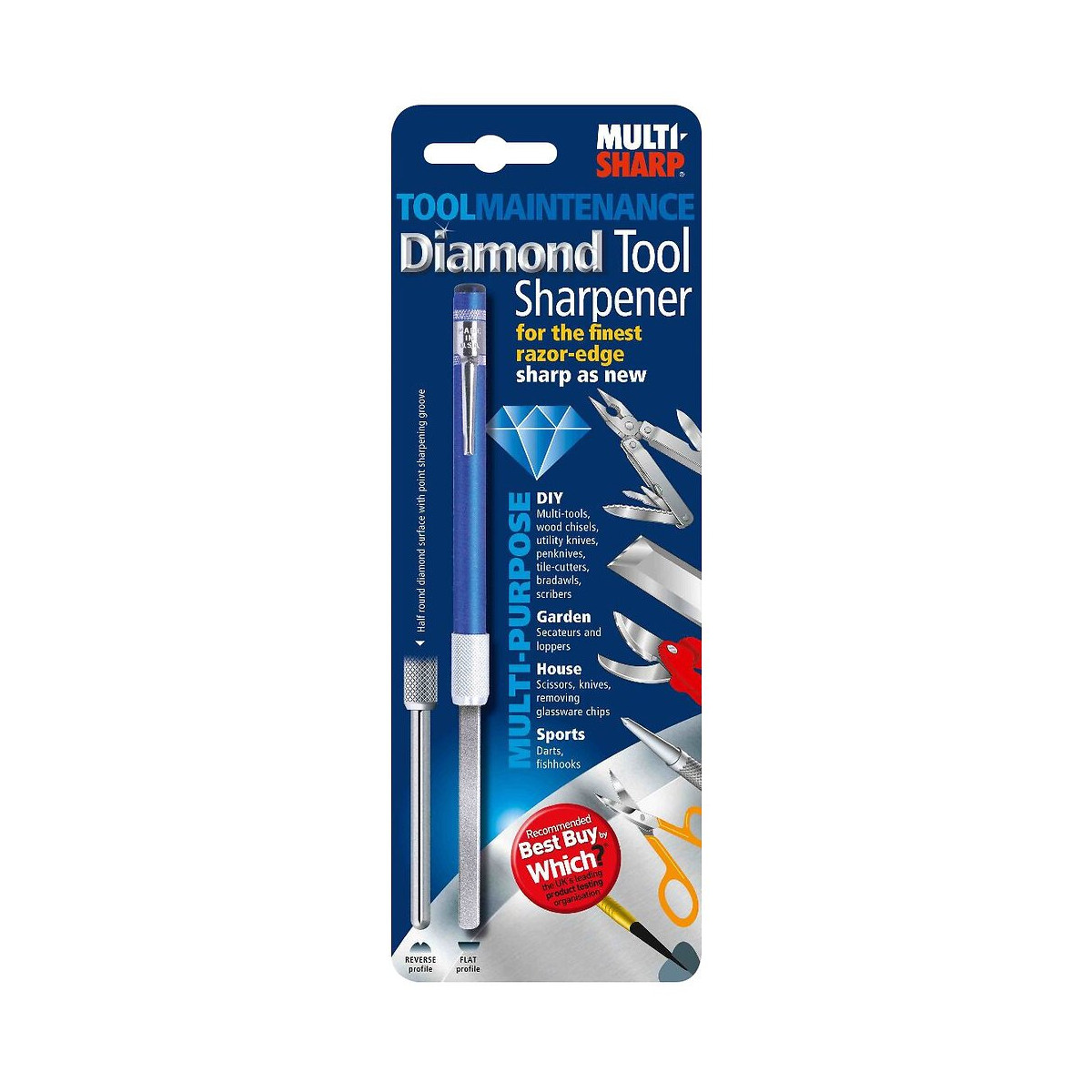 Affûteur universel en aluminium avec lame rétractable au diamant pour affûter tous les matériaux, y compris les plus durs tels que le carbure, la céramique ou l'inox. Lame multi-fonctions semi-ronde avec rainure pour aiguiser les lames courbes ou droites de couteaux et outils de jardin, les ciseaux à bois, les fers de rabot, les dents de scies, les pointes de fléchettes ou hameçons. Permet également de lisser les éclats de verre.