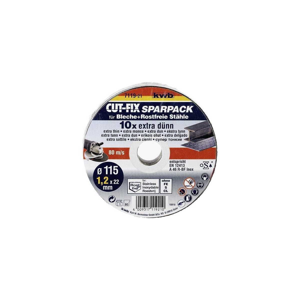 Lot de 10 disques à tronçonner extra-fins CUT FIX pour meuleuses, pour la coupe des métaux. 80m/sec Spécial pour la coupe de la tôle et d'aciers inox Diamètre 125mm Epaisseur : 1,2mm