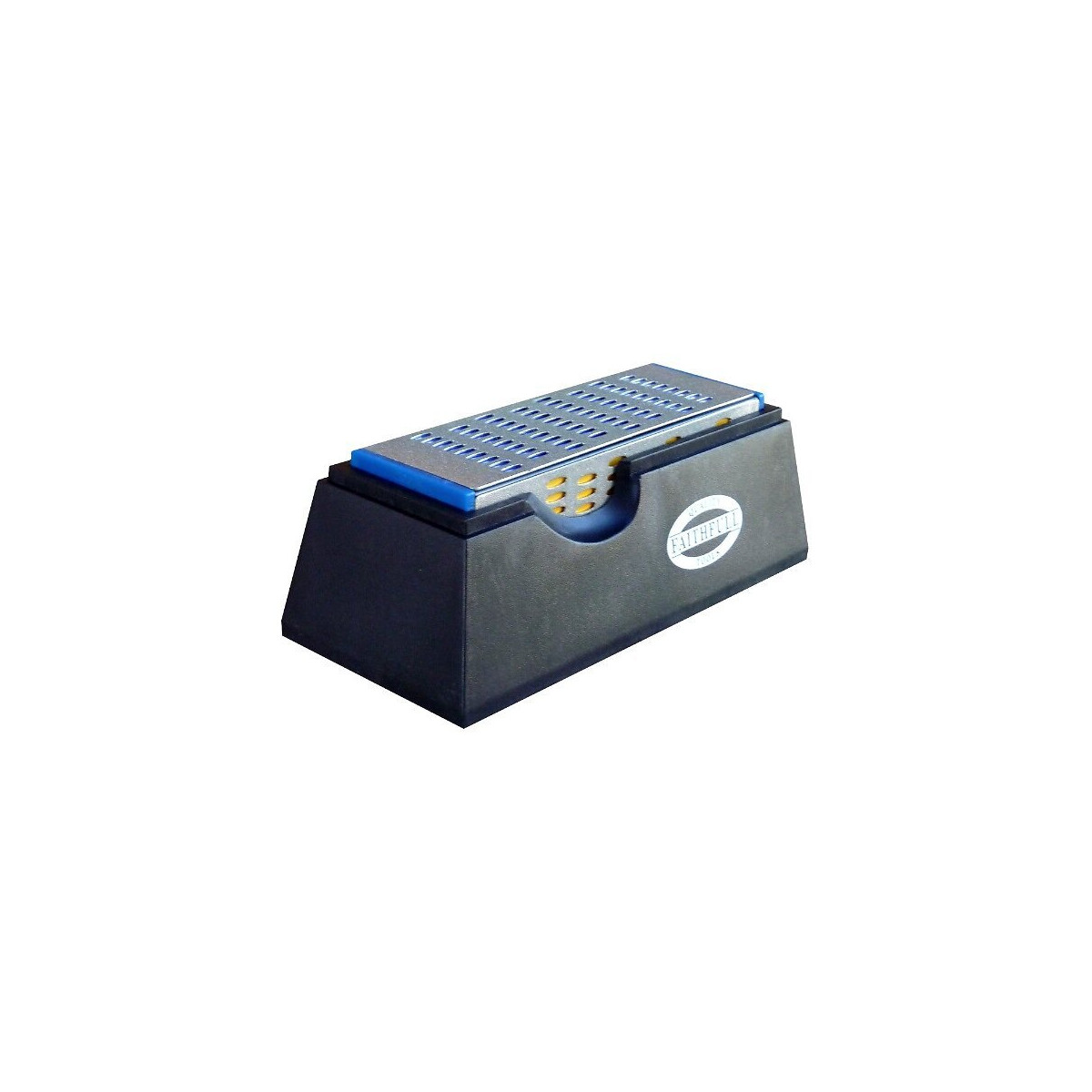 Pierre d'affûtage 4 grains (un grain par face). Livrée en dans son support en plastique. Permet un affûtage de précision et d’une grande efficacité de tous les outils HSS et carbure de tungstène, tels que les couteaux, ciseaux, fers de rabot, haches, cisailles, ... Code couleur pour un repérage facile du grain d'affûtage : 600, 400, 300 et 200. Dimensions = 4 faces 150 x 50 mm