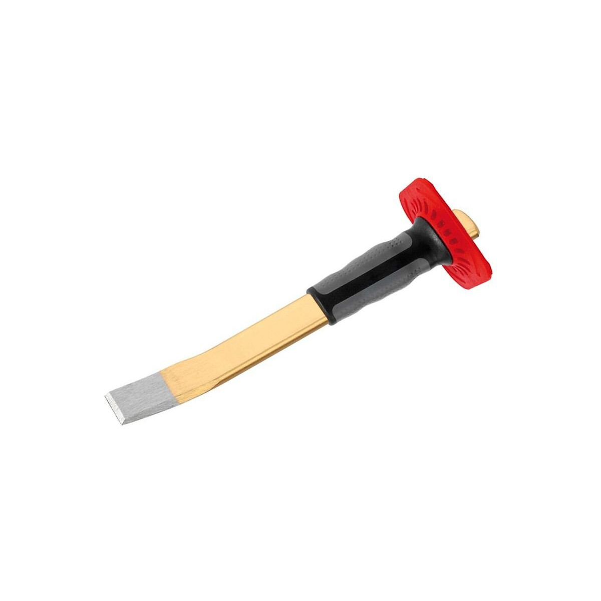 Burin coudé avec pare-coups 26 x 240 mm Burin coudé pour un travail à ras plus facile. En acier chrome vanadium finition peinture époxy dorée. Lame trempée polie avec un seul côté chanfreiné. Livré avec poignée pare-coups avec grip pour le confort et la sécurité. Fabrication Allemande.
