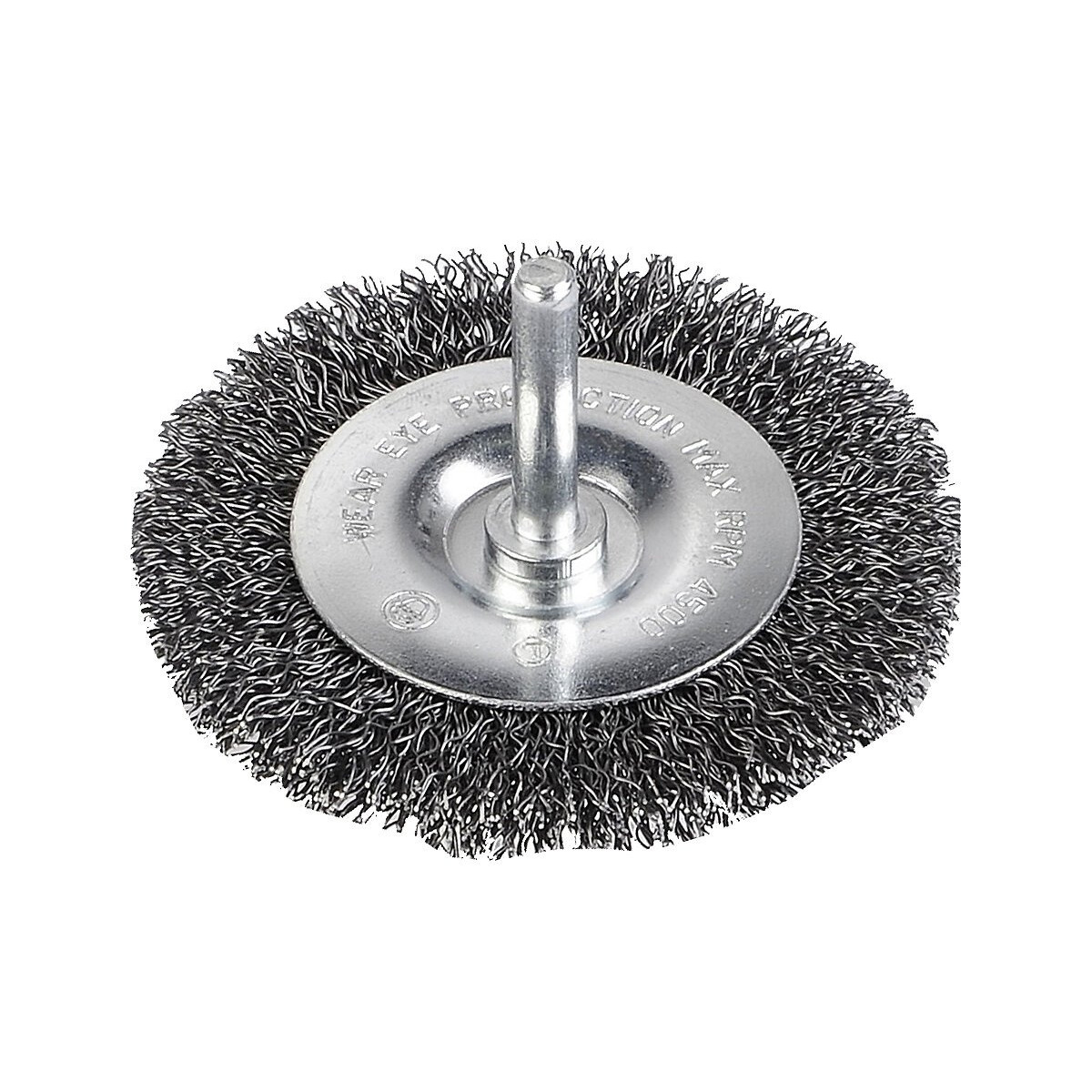 Brosse plate avec fils ondulés en acier. Pour enlever la rouille, la peinture, le ciment sur le bois, le métal, la pierre. Se monte sur une perceuse. Diamètre brosse : 100 mm Diamètre tige : 6 mm