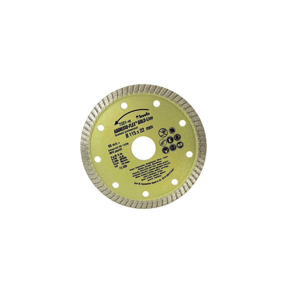 Disques diamant AGRESSO FLEX à jante continue, pour meuleuses d'angle. Disque diamant Gold-Line pour granit, béton, Klinker; tuiles en argile et béton, pierres naturelles et artificielles, carrelage réfractaire. Diamètre 115mm Alésage 22 mm Hauteur 7 mm Segment 2,1 mm