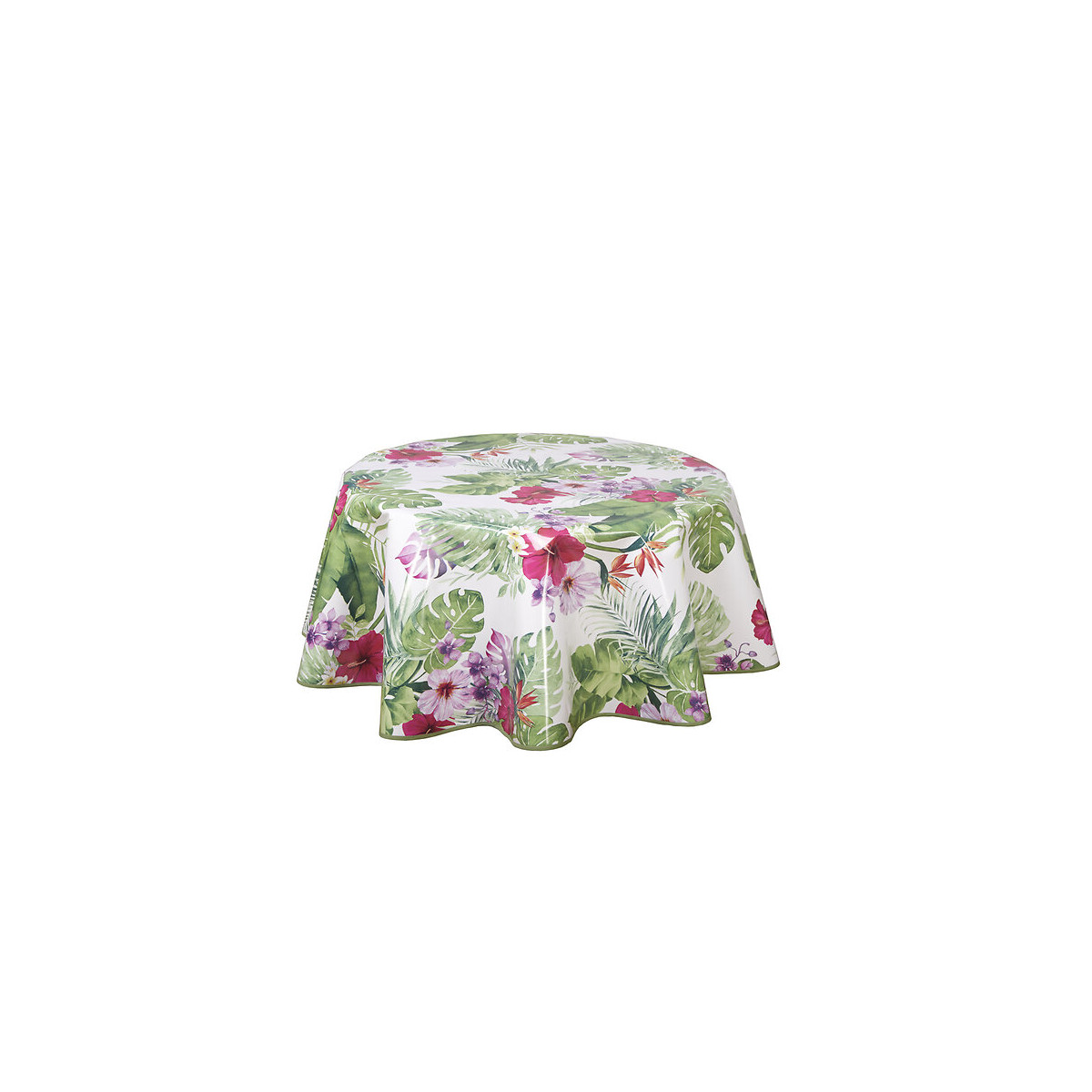 Nappe en toile cirée. Forme : rond. Finition : biais, laquée. Dimensions : diamètre 150 cm. Modèle : Jungle blanc.Spécifications techniques