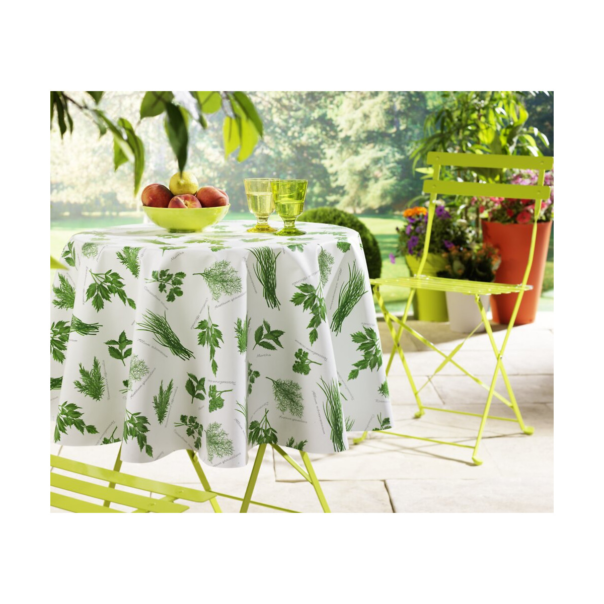 Nappe toile cirée PVC imprimée aromates vert ronde 140cm avec biais