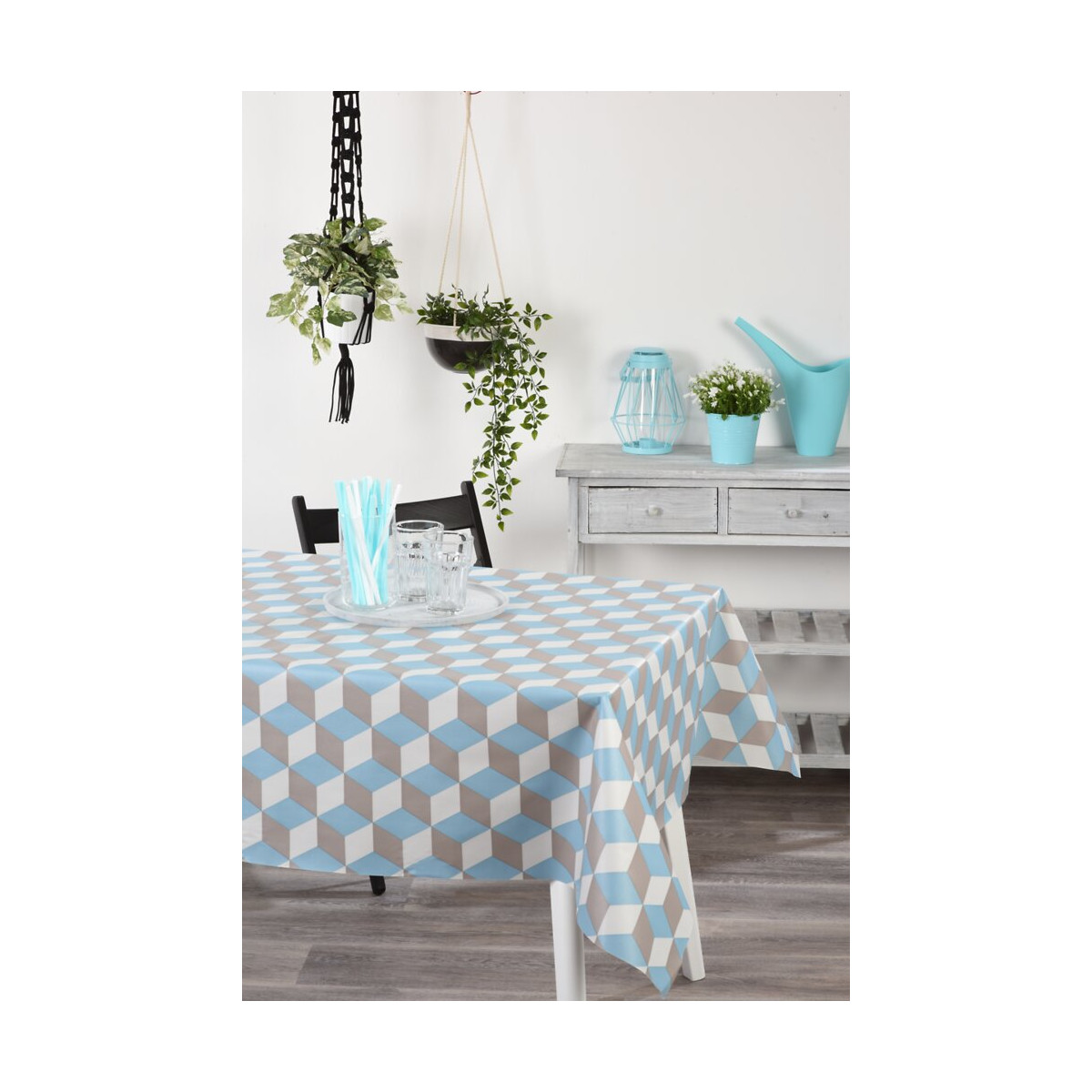 Nappe toile cirée PVC structuré imprimée cube bleu carré 140x140cm avec biais