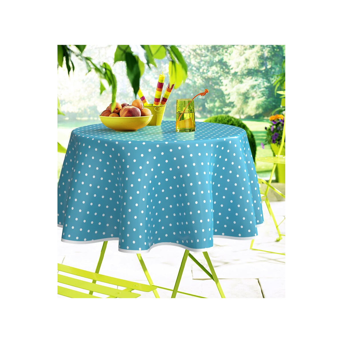 Nappe toile cirée standard PVC imprimée pois bleu ronde 140cm avec biais