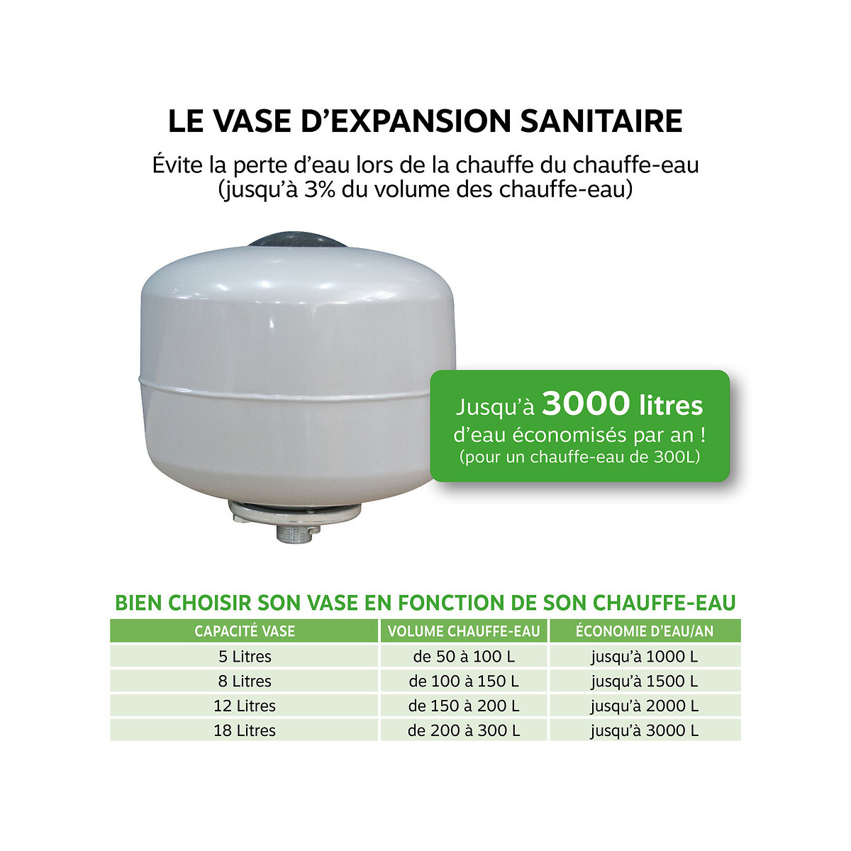 Il absorbe l'expansion de l'eau dûe à la montée en température de l'eau dans le chauffe eau. A chaque mise en température, la dilatation de l’eau pourra entraîner un écoulement pouvant atteindre 3% du volume du chauffe-eau.