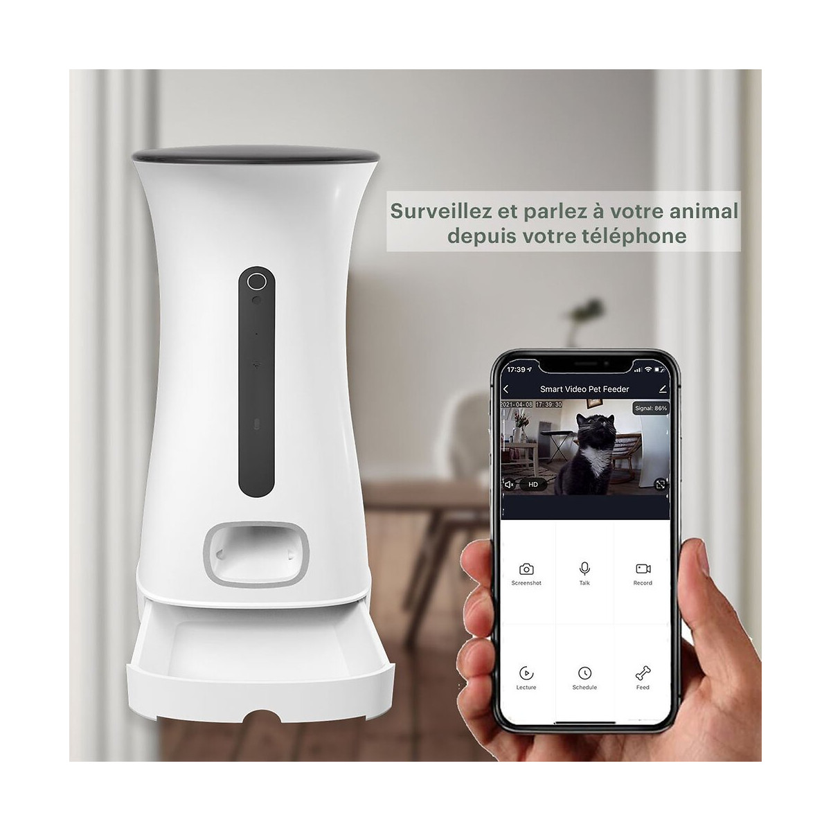 Nourrissez votre animal selon des horaires programmés ou manuellement et aidez-le à développer des habitudes alimentaires plus saines. Le + : Gardez un œil sur votre boule de poils préférée tout en sécurisant votre habitation grâce à la caméra discrète intégrée. Gardez un œil sur votre boule de poils préférée : Le distributeur se connecte sur l’application gratuite Daewoo Home Connect en Wifi. Enregistrez des moments inoubliables de votre animal (sur une carte SD – non incluse). Vous avez également la possibilité de parler à votre animal et de l’écouter. Le + : protégez votre logement grâce à la caméra intégrée. En cas d’intrusion une notification vous est envoyée en temps réel. Nourrissez votre animal : Programmez jusqu’à 8 repas par jour (sélectionnez le nombre de portions que vous souhaitez donner à votre animal : 1 portion = 10 grammes, maximum 200 grammes par repas). Vous pouvez également nourrir votre animal manuellement depuis l’application, ou directement sur le bouton du distributeur. Alimentation du distributeur : Il fonctionne avec une prise secteur ou avec des piles (non incluses). Si vous insérez des piles, en cas de coupure de courant, le distributeur passe automatiquement sur l’alimentation par piles afin que votre animal continue d’être alimenté. Introduisez jusqu’à 7,5 Litres dans le distributeur. Qualité et sécurité : Notre distributeur connecté n’est pas nocif pour votre animal. Ce produit est garanti 2 ans et bénéficie d’une assistance technique par mail 100% Française.