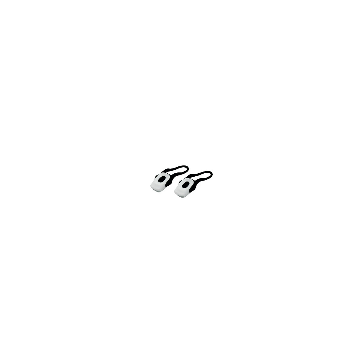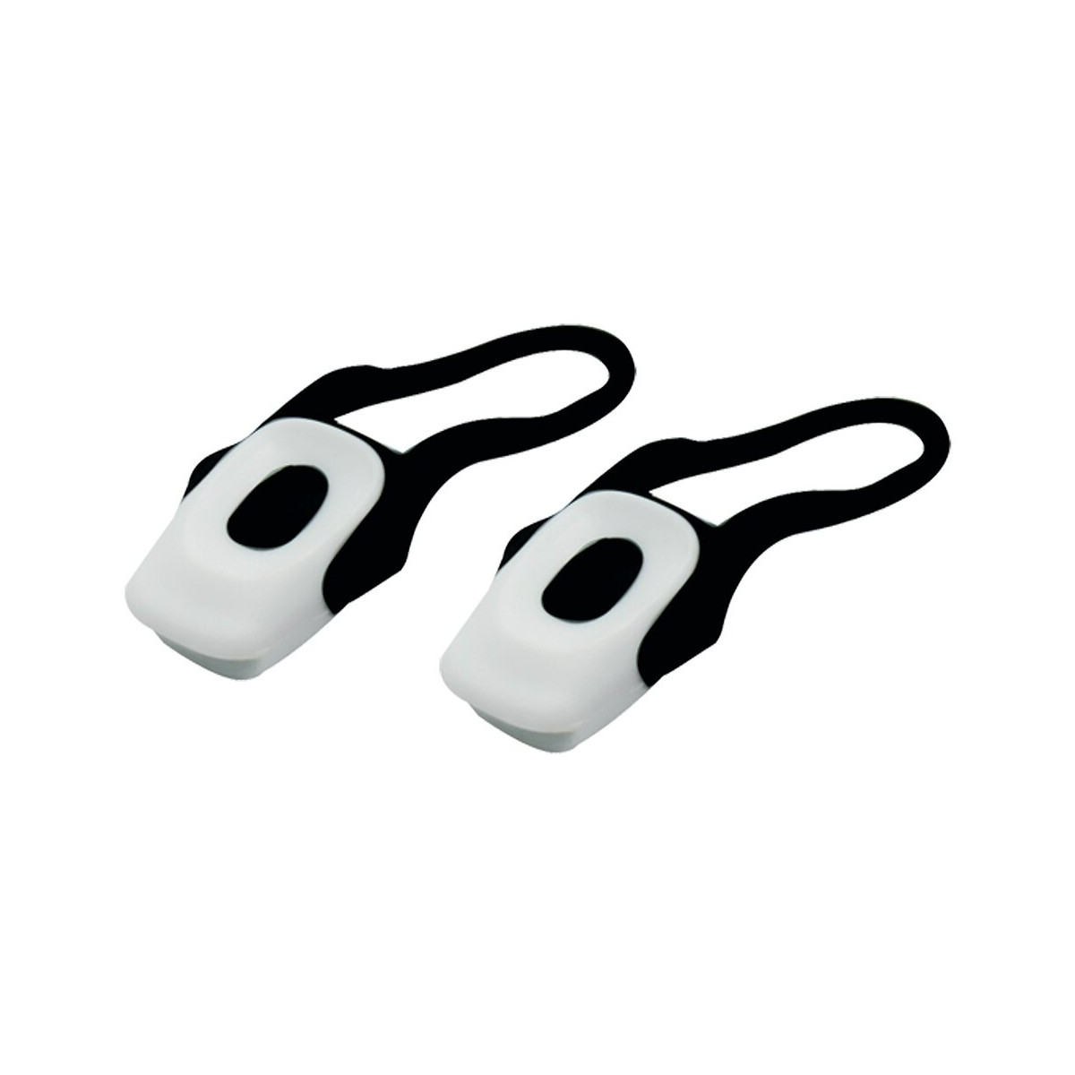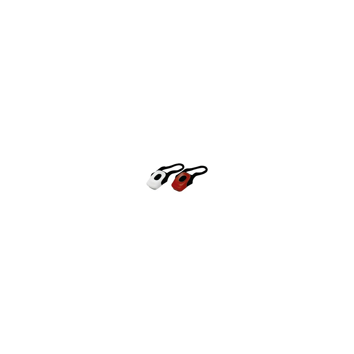Kit d'éclairage silicone avant + arrière. Avant LED blanche - Arrière LED rouge. Durée de vie : - mode continu jusqu'à 160 h - mode flash jusqu'à 220 h. Ajustable : diamètre de 22 à 35 mm. Poids : 20 g. Piles CR2025 fournies (x2).