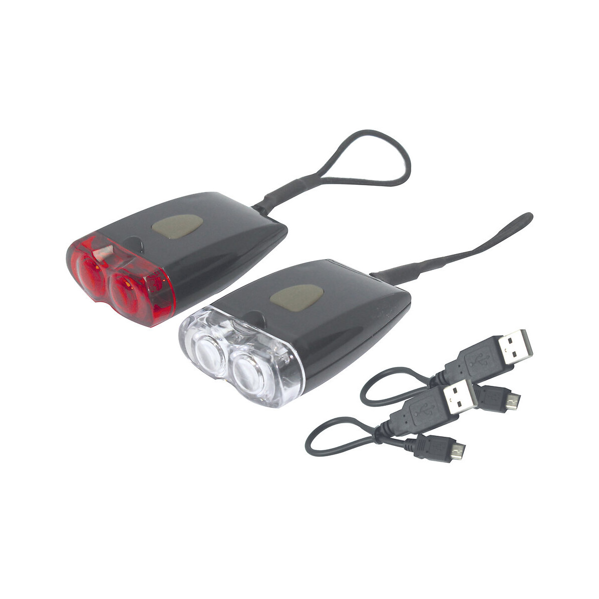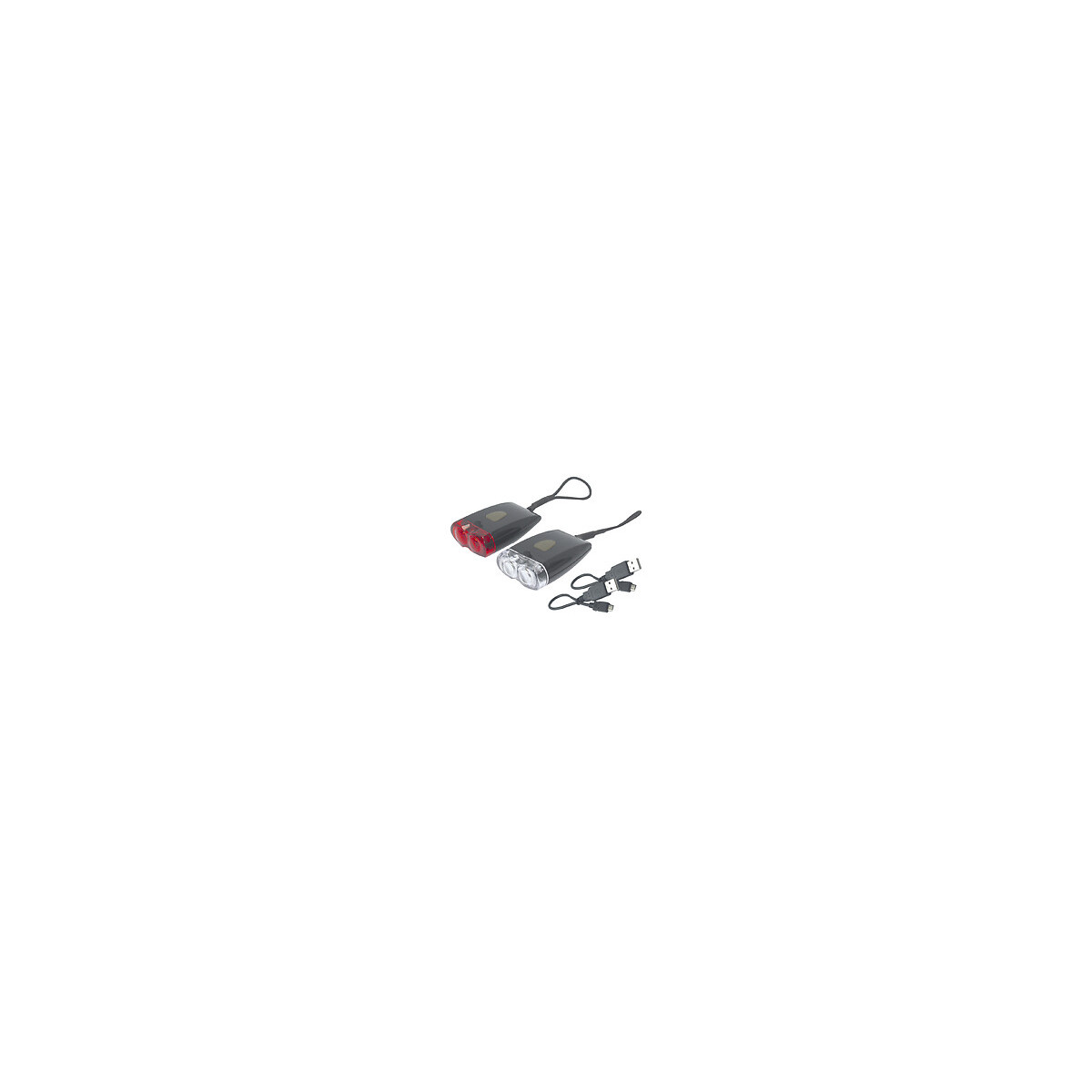 Kit d'éclairage rechargeable USB. Avant + Arrière. Avant 2 leds blanches - Arrière 2 leds rouges. Autonomie : - mode continu : 3 h - mode flash : 6 h. Temps de charge : 3 h 2 câbles USB fournis. Couleurs panachées blanc - noir.