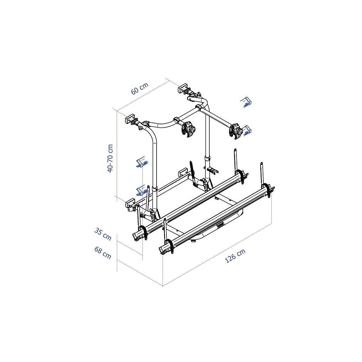 Porte 2 vélos avec cadre en aluminium. Plateforme verrouillable pendant la route. Rails coulissants pour faciliter le placement des vélos. Montage possible sur pattes de fixation Fiamma. Charge max. : 50 kg. Avec 2 rails et 2 Bike Holders. Recommandé pour une paroi de 40 a 70 cm. Poids : 6,8 kg.
