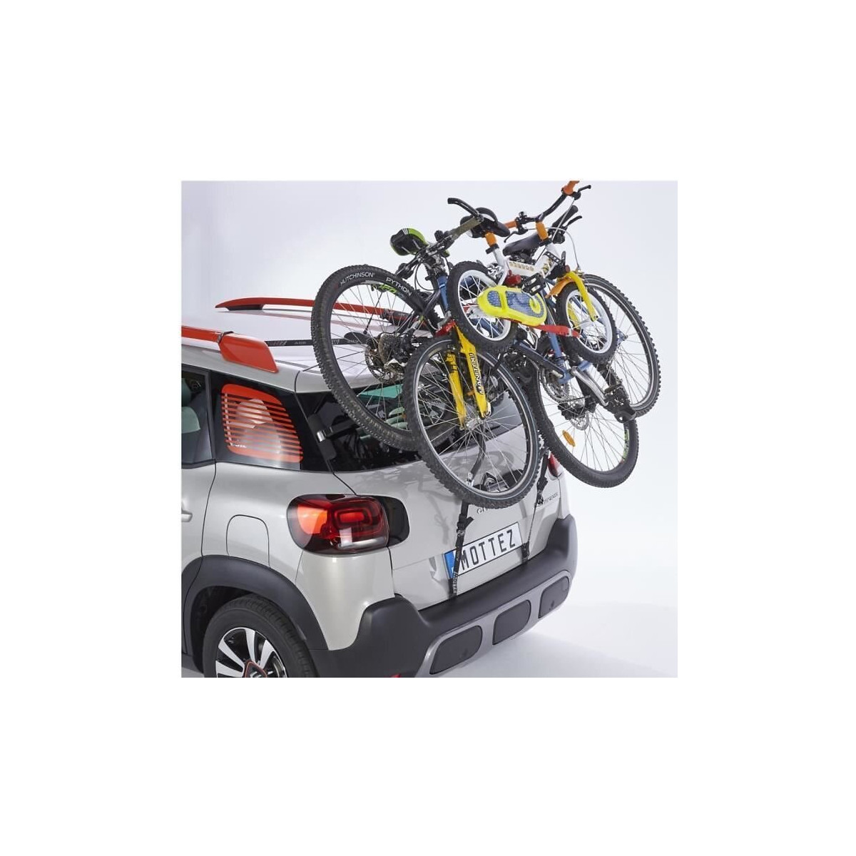 Porte-vélos 3 vélos sur Hayon a fixation sur barres de toit ou barre railing avec antivol- Crabots pour réglage ultra rapide - 5 sangles de fixation : 2 hautes sur barres, 1 centrale passante coffre et 2 basses sur hayon - Fixation des vélos par 6 bloc