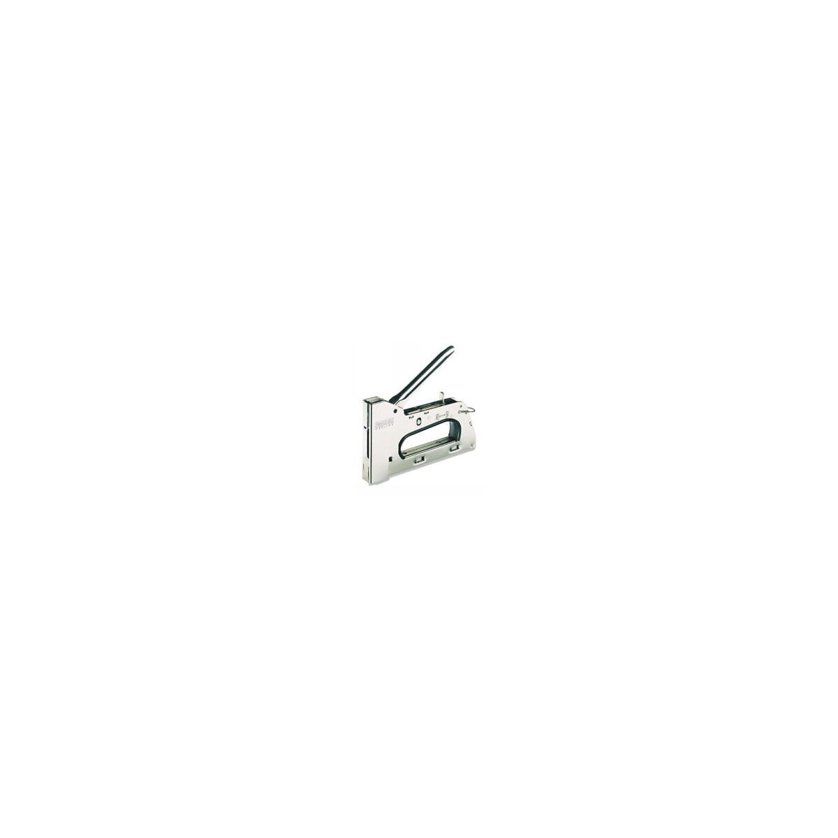 Agrafeuse Pro R34. Corps métal chromé. Puissance de frappe réglable. Recommandée pour la fixation des revêtements plastiques, matériaux d'isolation, moquettes,... Utilise des agrafes n° 4 - 11 ou 140 de 6 à 14 mm.