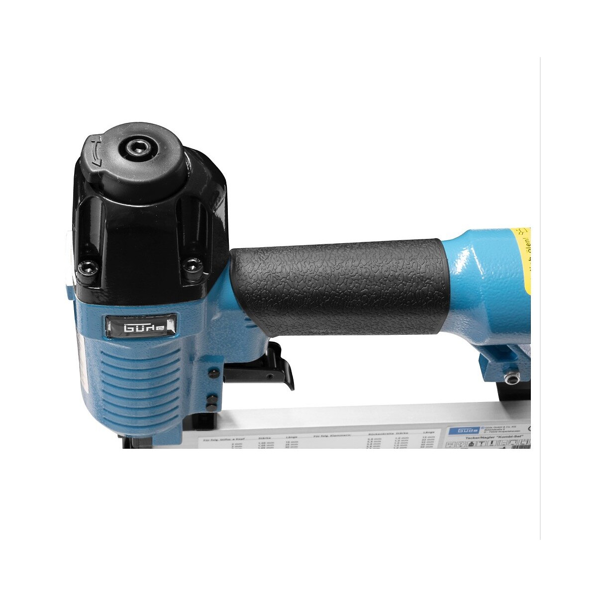 Contenu de la livraison: - 1x Güde Agrafeuse à air comprimé 6 bar IG 1/4" ( 40220 ) - 1x Coffret de transport - 1x Serrure de sécurité à impact - 1x Lunettes de sécurité - 1x Bouteille d'huile - 2x Clés hexagonale - 500x Agrafes 20 mm - 500x Agrafes 32 mm - 500x Agrafes 40 mm - 1000x Broches 25 mm - 1000x Broches 40 mm Description du produit: L'agrafeuse et cloueuse à air comprimé de Güde est l'outil idéal pour les travaux d'intérieur pour fixer du bois ou des plaques de plâtre, par exemple. Même les plafonds et les revêtements muraux ainsi que la fixation de feuilles isolantes ne posent aucun problème à l'agrafeuse et au cloueur. Mais l'outil est également polyvalent pour les travaux de tapisserie et les décorations et permet ainsi un travail rapide et efficace. Le verrou de sécurité à impact assure un haut niveau de sécurité en empêchant les agrafes ou les clous de se détacher accidentellement. L'outil peut être rangé soigneusement dans la mallette pour gagner de la place et une réserve de base de clous et d'agrafes y est déjà rangée. Güde est l'un des principaux fabricants d'outils électriques. Une longue tradition et des normes de qualité élevées distinguent l'entreprise. Spécifications techniques: Fabricant : Güde Nom du fabricant : Agrafeuse / cloueuse à air comprimé Numéro de fabricant 40220 Filetage de connexion : IG 1/4 " Pression de travail : 6 bar Epaisseur du clou : 1,05 mm Longueur maximale du clou : 40 mm Épaisseur de la tête : 2 mm Epaisseur de l'agrafe : 1 mm Longueur max. de la jambe : 40 mm Largeur de l'agrafe : 5,8 mm Dimensions : 266 x 250 x 60 Poids : 3,78 kg
