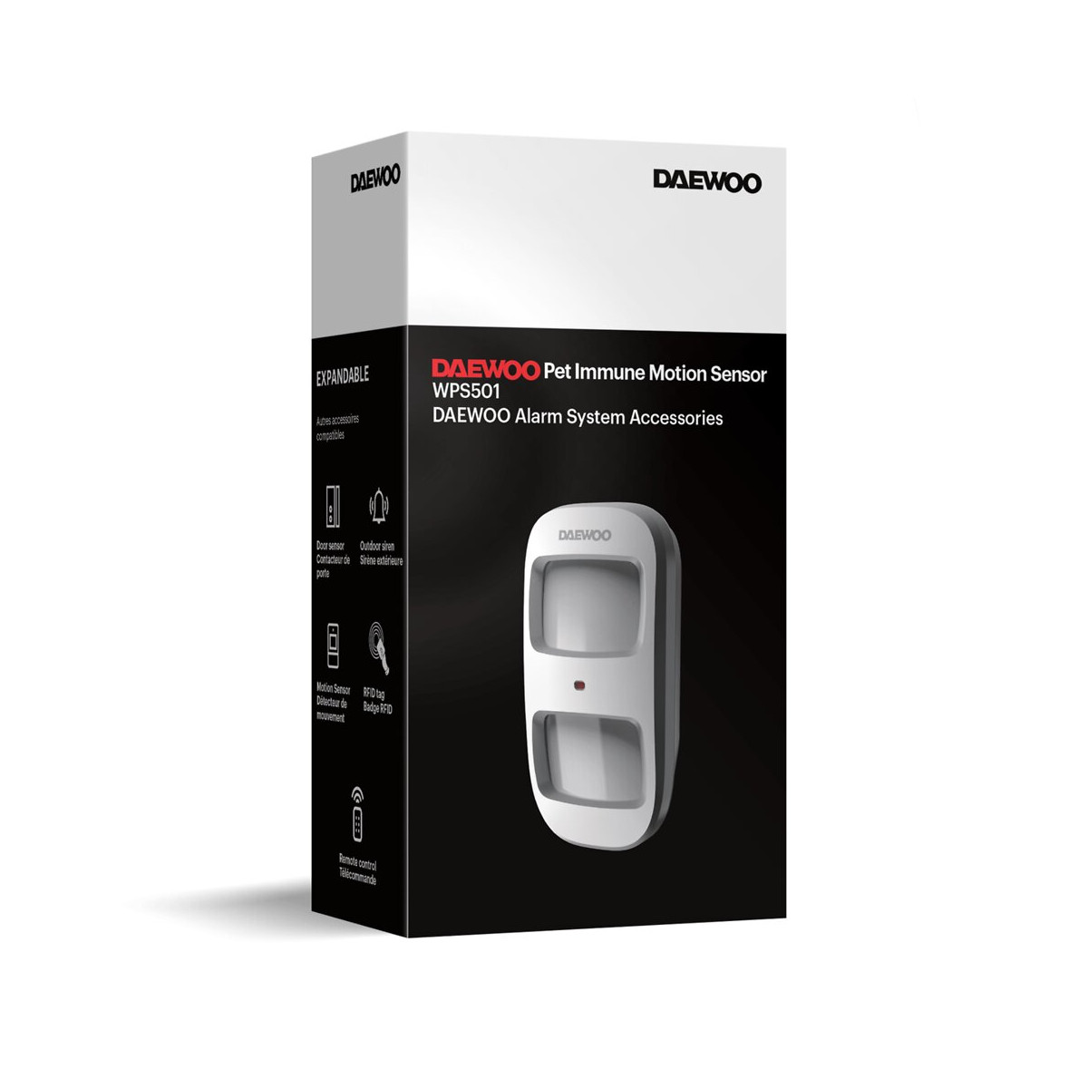 Le détecteur de mouvement DAEWOO WPS501 est compatible avec le système d'alarme SA501. En cas d'intrusion, il déclenche automatiquement l'alarme et prévient l'utilisateur sur son smartphone. SIMPLICITÉ D'INSTALLATION S'installe en quelques minutes Peut être posé sur un meuble ou être fixé au mur grâce à son support mural et ses adhésifs double face. Application DAEWOO Home connect gratuite disponible sur iOS et Android SÉCURITÉ ET FIABILITÉ Prévient automatiquement en cas de niveau faible de la pile Connexion RF868 Mhz COMPATIBILITÉ ANIMAUX Plus de fausses alertes ! Il cohabite avec les animaux domestiques de moins de 25 kg au sol et à condition qu'il reste à distance de 2m du détecteur. COMPATIBILITE Système d'alarme DAEWOO SA501