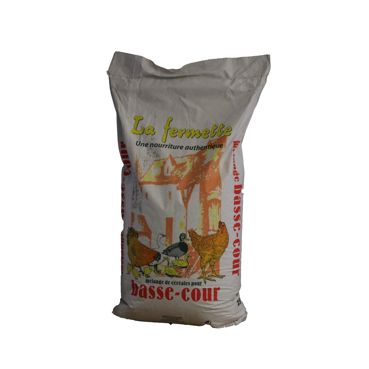 Mélange de céréales pour basse-cour avec écailles de coquilles d'huîtres, sac 25kg. À conserver dans un endroit frais et sec, à l'abri de la lumière. Ce mélange de céréales apportera une alimentation complémentaire aux animaux de votre basse-cour et répondra parfaitement à leurs besoins. Notre conseil : prévoyez de 100 à 150g/jour suivant le gabarit, la volaille ajustera d'elle-même sa consommation. Laissez de l'eau propre et fraîche à volonté.Spécifications techniques