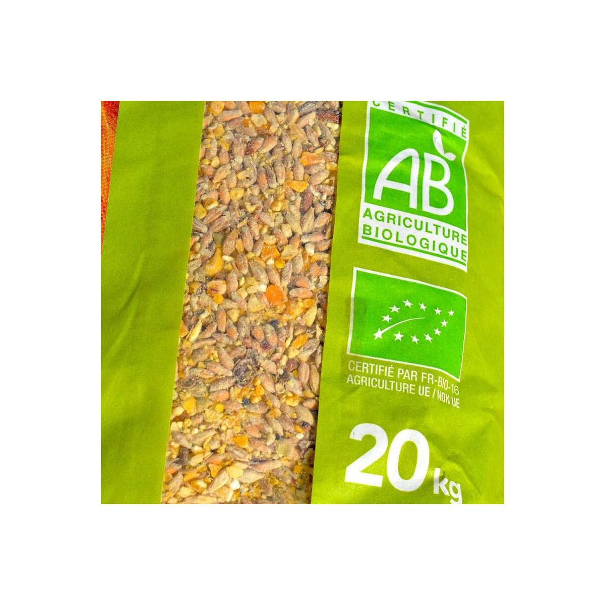 Aliment mélange traditionnel fermier bio, 20KG. Destination : Mélange de céréales protéagineux destiné à l'ensemble de la basse-cour. Mélange multi-espèces : volailles, palmipèdes, bovins, ovins, caprins, porcs... Aliment mélange traditionnel fermier bio, 20KG. Mode d'emploi : Distribuer à volonté ou en complément d'aliment bio. Eau claire à tenir en permanence à la disposition de vos animaux. Ingrédients : Maïs concassé*, Triticale*, Blé*, Féveroles Concassées*, Orge*. * 100% d'ingrédients d'origines agricole provenant de l'agriculture biologique Photo non contractuelle, car il y a plusieurs vendeurs sur une même fiche produit.Spécifications techniques