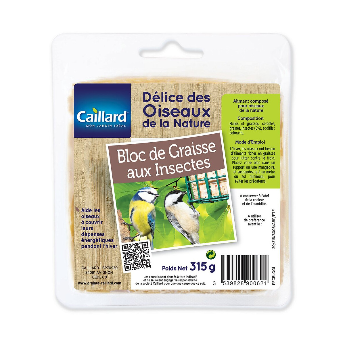 Le bloc de graisse aux insectes, les oiseaux en raffolent, Très nutritif, source de ,protéines il leurs assure une alimentation riche pendant l'hiver.Spécifications techniques