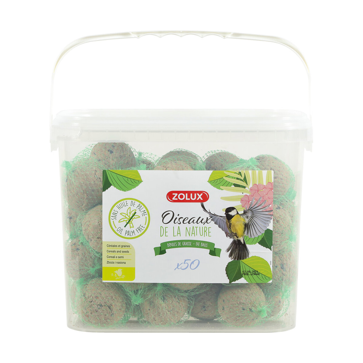 Constituées de céréales, huiles, graines et graisse, ces boules offrent aux oiseaux l'apport énergétique dont ils ont besoin, surtout en hiver. Livrées dans un seau pour une meilleure conservation. , ,Spécifications techniques