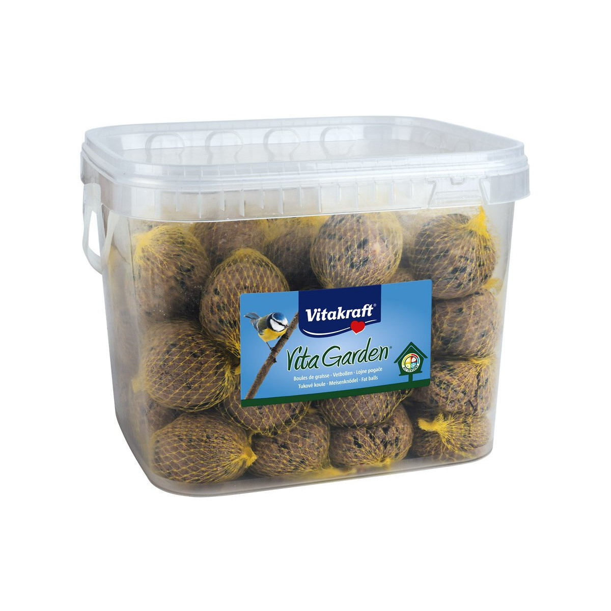 60 délicieuses boules de graisse riches en protéines et matières grasses. Aide essentielle aux oiseaux de la nature en toute saison afin de leur fournir les nutriments nécessaires à une alimentation complète, riche et variée. Livrées dans un seau transparent, en filet individuel. Faciles à accrocher.