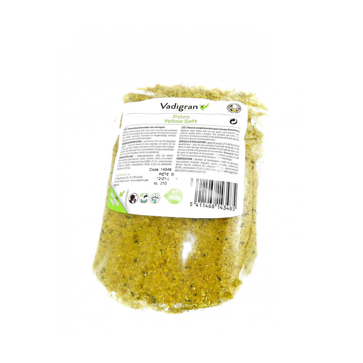 Pâtée soft jaune 700 gr. Aliment complémentaire pour oiseaux d' ornement. Donner aux oiseaux une alimentation de qualité à base de graines est indispensable pour leur santé, leur bien-être ainsi que pour la beauté de leur plumage. Cependant, à certaines périodes de l'année, les oiseaux d'élevage ont besoin d'un complément en vitamines, minéraux et protéines. Les pâtées vont leur offrir ce petit surplus qui rendra leur alimentation appropriée et équilibrée à ces périodes plus délicates. Elle contient une variété de vitamines, minéraux essentiels et des protéines de haute qualité. Convient à tous les oiseaux granivores. Aliment complémentaire pour oiseaux d'ornement. sachet refermable. Pâtée soft jaune 700 gr. Aliment complémentaire pour oiseaux d' ornement. Pourquoi une pâtée pour oiseaux? Donner aux oiseaux une alimentation de qualité à base de graines est indispensable pour leur santé, leur bien-être ainsi que pour la beauté de leur plumage. Cependant, à certaines périodes de l'année, les oiseaux d'élevage ont besoin d'un complément en vitamines, minéraux et protéines. Les pâtées vont leur offrir ce petit surplus qui rendra leur alimentation appropriée et équilibrée à ces périodes plus délicates. Elles contiennent en effet une large variété de vitamines, minéraux et protéines qui auront chacun leur fonction et donc leur apport spécifique. Les protéines ont pour fonction d'apporter les acides aminés essentiels au bon fonctionnement du métabolisme de l'oiseau. C'est ainsi que les pâtées Vadigran contiennent des protéines de haute qualité comportant 29 acides aminés. Vadigran Patee Yellow Soft est une pâtée semi-humide d'excellente qualité prête à l'emploi. Elle contient une variété de vitamines, minéraux essentiels et des protéines de haute qualité. Convient à tous les oiseaux granivores. Aliment complémentaire pour oiseaux d'ornement. Type d'alimentation: Supplémentaire. Animal: Oiseau. Largeur: 18 cm. Hauteur: 25 cm. Longueur: 8 cm. Stade de vie: Tous âges. Propriété: Humide. Contenu du produit: 0.7 kg. COMPOSITION Produits de boulangerie, huiles et graisses, sous-produits d'origine végétale, sucres, céréales (5%), semences (1,5%), œufs et produits dérivés des œufs. Contient des colorants (E102), conservateurs (E200), antioxydants (E320, E330) et des agents anti-agglomérants (E551a). Instructions : Apporter jusqu'à 25% de la portion quotidienne. – tous les jours pendant la période d'élevage et de show et deux fois par semaine pendant la période de mue. Les oiseaux à grande nichée peuvent en recevoir plus. Renouveler tous les jours la nourriture et l'eau potable. Conserver au frais et au sec. Photo non contractuelle, car il y a plusieurs vendeurs sur une même fiche produit.