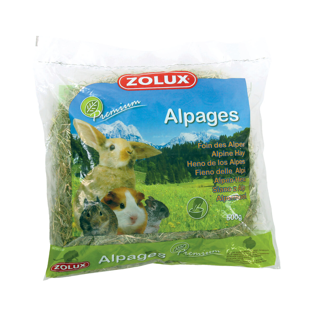 Un foin de qualité "Premium". Aliment complémentaire pour rongeurs. Foin des Alpes de 1ère coupe, sélectionné pour ses qualités nutritionnelles, aromatiques et une appétence supérieures. Alpages Premium est riche en fibres, minéraux et oligo-éléments naturels. Le séchage rapide du foin en montagne permet une conservation optimale des éléments nutritionnels et des pigments. Alpages Premium est ensaché manuellement afin de préserver de longs brins, limiter les poussières et procurer un meilleur confort d’utilisation. Dimensions : Longueur 50 cm x Largeur 50 cm x Profondeur 7,5 cm. Poids : 500 g.