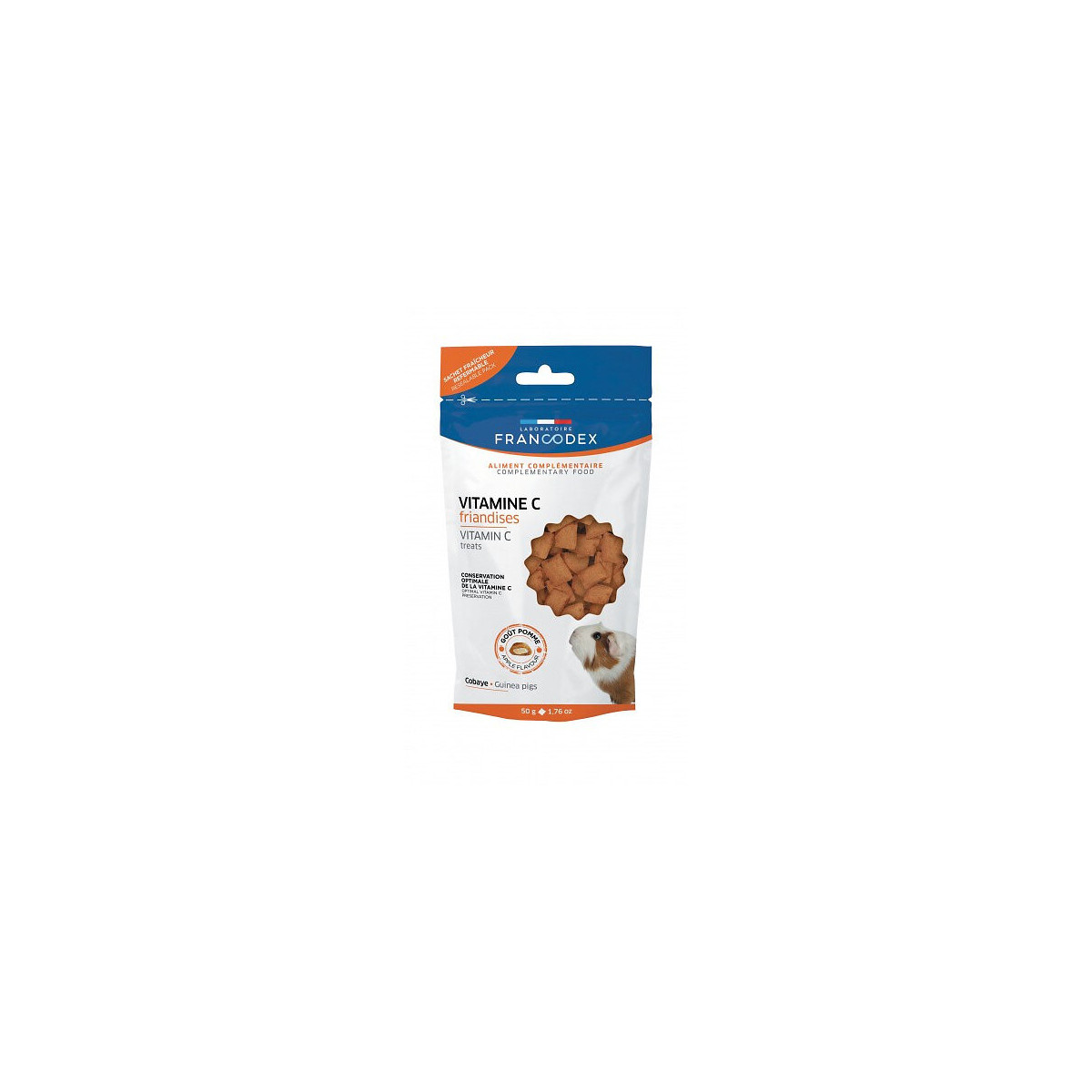 Friandises Vitamine C Pour Cobayes LES + PRODUITS Conservation optimale de la Vitamine C Appétence Sachet de 50 g Les FRIANDISES VITAMINE C FRANCODEX sont un moyen original d'apporter la dose quotidienne de vitamine C à votre cochon d'Inde. Elles peuvent s'utiliser comme source principale de vitamine C, ou comme supplémentation d'une autre source de vitamine C (liquide, végétaux frais, comprimés...). Le besoin quotidien en vitamine C du cochon d'Inde en bonne santé est de 20mg/kg. Ce besoin triple lors de maladie, convalescence, gestation et lactation (60mg/kg). En entretien : cochon d'Inde < 1 kg : 2 friandises par jour ; Cochon d'Inde > 1 kg : 3 friandises par jour. En période de convalescence, de gestation et de lactation : tripler la dose, soit 6 friandises par jour. Il est préférable d'attendre la fin de la période de sevrage (10 semaines d'âge) avant de donner des friandises à de jeunes rongeurs. Cet aliment complémentaire ne doit pas se substituer à une alimentation équilibrée. Utiliser dans le mois suivant l'ouverture. Mettre à disposition de l'eau fraiche à volonté. En cas d'utilisation concomitante avec d'autres compléments en vitamine C, veiller à respecter les doses quotidiennes recommandées. Tenir hors de portée des enfants. A conserver dans un endroit frais et sec. Produit non destiné à la consommation humaine. Photo non contractuelle, car il y a plusieurs vendeurs sur une même fiche produit.