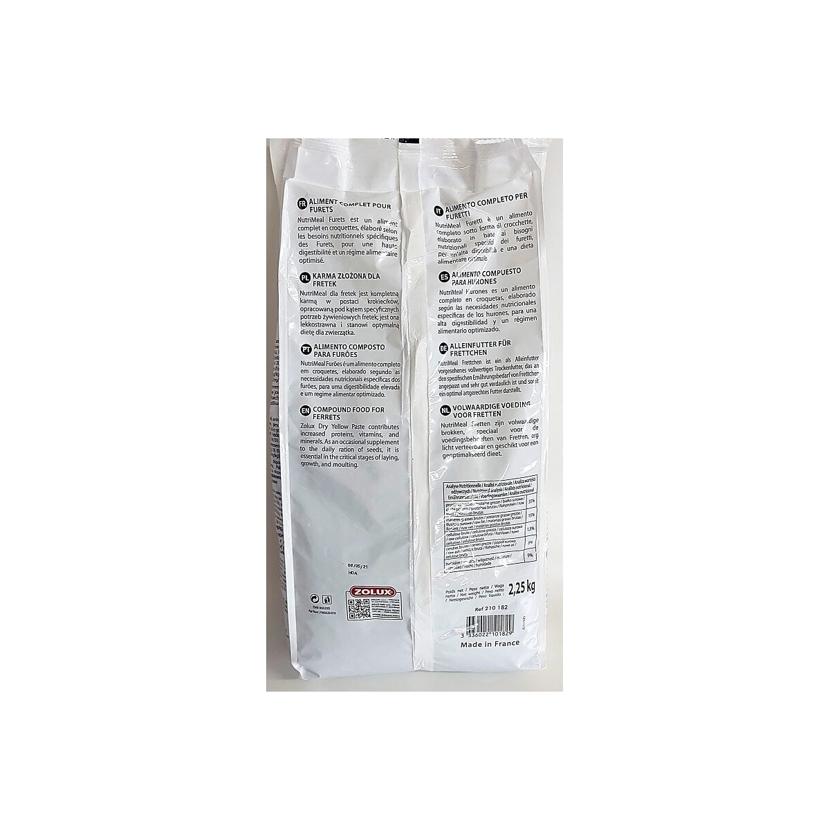 ALIMENT COMPLET POUR FURETS NutriMeal Furets est un aliment complet en croquettes, élaboré selon les besoins nutritionnels spécifiques des Furets, pour une haute digestibilité et un régime alimentaire optimisé. COMPOSITION: Viandes et sous-produits d'animaux 30%, sous-produits d'origine végétale, poissons et sous-produits de poissons 12 %, céréales (Mais 15%), huiles et graisses, produits de la boulangerie, levures, substances minérales. MODE D'EMPLOI: Mettre à disposition quotidiennement en quantité suffisante. Nettoyer la mangeoire chaque Jour et tenir à disposition permanente de l'eau propre et fraîche. A consommer de préférence avant la date limite d'utilisation optimale figurant sur l'emballage. sachet de 2.25 kg ALIMENT COMPLET POUR FURETS NutriMeal Furets est un aliment complet en croquettes, élaboré selon les besoins nutritionnels spécifiques des Furets, pour une haute digestibilité et un régime alimentaire optimisé. COMPOSITION: Viandes et sous-produits d'animaux 30%, sous-produits d'origine végétale, poissons et sous-produits de poissons 12 %, céréales (Mais 15%), huiles et graisses, produits de la boulangerie, levures, substances minérales. Additifs : Vitamines et pro vitamines (Vit A 20 000 Ul/kg - Vit D3 2000 UI/kg - Vit E 200mg/kg ), Composés d'oligo-éléments (E2 (0,74mg/kg), E4 (5,50 mg/kg), E5 (56mg/kg. E8 (0,2mg/kg), Antioxygènes (E320 (24 mg/kg), E321 (72mg/kg)). MODE D'EMPLOI: Mettre à disposition quotidiennement en quantité suffisante. Nettoyer la mangeoire chaque Jour et tenir à disposition permanente de l'eau propre et fraîche. A consommer de préférence avant la date limite d'utilisation optimale figurant sur l'emballage. sachet de 2.25 kg Photo non contractuelle, car il y a plusieurs vendeurs sur une même fiche produit.