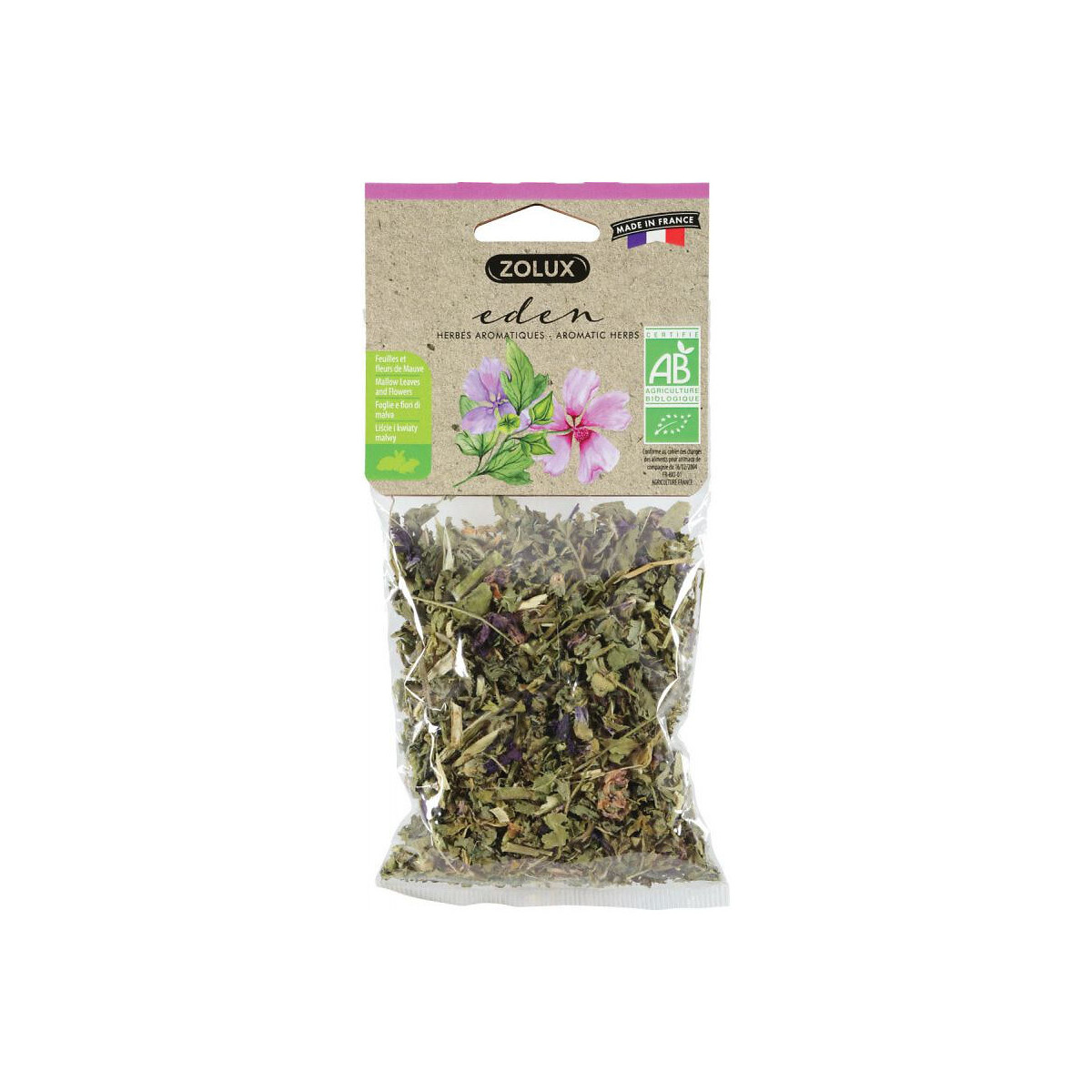 Friandise eden herbes aromatiques feuilles et fleurs mauve. Matière première pour petits mammifères- animaux familiers. Eden herbes aromatiques est une friandise naturelle. La mauve étant reconnue pour ses vertus digestive. Eden feuilles et fleurs de mauve participera au bien-être de votre petit animal tout en lui procurant un véritable plaisir gustatif de qualité. Feuilles et fleurs mauve 25g. Friandise eden herbes aromatiques feuilles et fleurs mauve. Matière première pour petits mammifères- animaux familiers. Eden herbes aromatiques est une friandise naturelle. La mauve étant reconnue pour ses vertus digestive. Eden feuilles et fleurs de mauve participera au bien-être de votre petit animal tout en lui procurant un véritable plaisir gustatif de qualité. Feuilles et fleurs mauve 25g. Mode d'emploi : 1 à 2 fois par semaine en complément de son alimentation habituelle. Mettre toujours de l'eau propre et fraîche à disposition. Photo non contractuelle, car il y a plusieurs vendeurs sur une même fiche produit.
