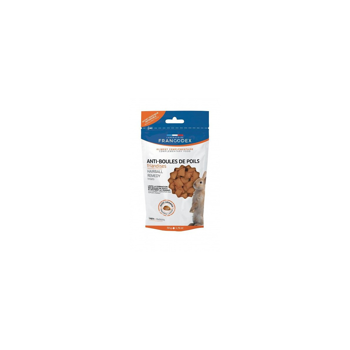 Friandises Anti-Boules de Poils. Pour Lapins. Sachet de 50 g. LES + PRODUITS. Limite la formation des boules de poils. Soutient le transit digestif. Lors de la période de mue, les lapins sont sujets à la formation de boules de poils dans leur estomac, qui peuvent avoir des conséquences importantes, allant parfois jusqu'à l'arrêt du transit. Les friandises anti-boules de poils Francodex contiennent du malt et de la papaye pour stimuler le transit digestif et limiter la formation des boules de poils, ainsi que de l'inuline pour soutenir la flore intestinale. De plus, ces friandises sont particulièrement appétissantes grâce à leur arôme ananas. Lapin < 1 kg : 3 friandises par jour ; Lapin > 1 kg : 5 friandises par jour. Il est préférable d'attendre la fin de la période de sevrage (10 semaines d'âge) avant de donner ces friandises. Toujours associer à un brossage quotidien pendant la période de mue afin de limiter l'ingestion de poils par l'animal. Cet aliment complémentaire ne doit pas se substituer à une alimentation équilibrée. Utiliser dans le mois suivant l'ouverture. Mettre à disposition de l'eau fraiche à volonté. Tenir hors de portée des enfants. À conserver dans un endroit frais et sec. Produit non destiné à la consommation humaine. Photo non contractuelle, car il y a plusieurs vendeurs sur une même fiche produit.