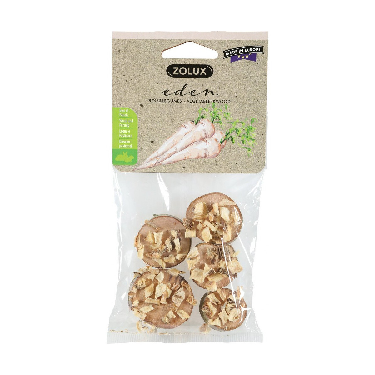 Friandise eden bois et panais pour petits mammifères. Aliment complémentaire pour petits mammifère-animaux familiers. Eden bois et légumes composé uniquement d'ingrédient naturels. Une friandise qui aidera votre petit animal à faire réguler sa poussée dentaire tout en lui procurant un véritable plaisir gustatif. les légumes sont fixés sur le bois grâce à une matière naturelle , la fécule de pomme de terre. Rondelles bois panais 40g. Friandise eden bois et panais pour petits mammifères. Aliment complémentaire pour petits mammifère-animaux familiers. Eden bois et légumes composé uniquement d'ingrédient naturels. Une friandise qui aidera votre petit animal à faire réguler sa poussée dentaire tout en lui procurant un véritable plaisir gustatif. les légumes sont fixés sur le bois grâce à une matière naturelle , la fécule de pomme de terre. Rondelles bois panais 40g. Mode d'emploi : 1 à 2 fois par semaine en complément de son alimentation habituelle. Mettre toujours de l'eau propre et fraîche à disposition. Photo non contractuelle, car il y a plusieurs vendeurs sur une même fiche produit.