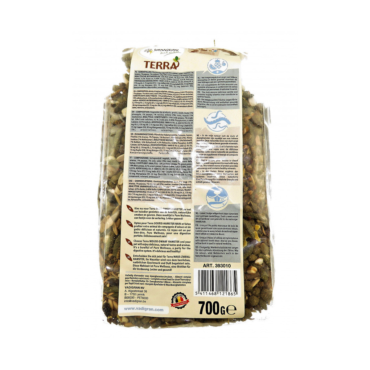 Complément alimentaire Terra souris et hamster nain 700 g. rongeurs. Optez pour TERRA souris/hamster nain et faites profiter votre animal de compagnie d'odeurs et de goûts délicieux et naturels. Ce repas est un pur bien-être, Pure Wellness, pour une digestion parfaite. Délicieusement sain ! Les compléments de fruits assurent une agréable alternance et contiennent de saines vitamines qui permettent d'optimiser la santé. Dans la nature, la souris et le hamster nain complète son repas avec de délicieux insectes. Cette source naturelle de protéines procure un supplément d'énergie et comporte des minéraux sains. Unique ! De petits morceaux de bois de saule garantissent une usure dentaire idéale. Comme vous le savez, le bois de saule est également utilisé en médecine douce. Complément alimentaire Terra souris et hamster nain 700 g. rongeurs. Caractéristique: Avec des vitamines, Au fruit. Optez pour TERRA souris/hamster nain et faites profiter votre animal de compagnie d'odeurs et de goûts délicieux et naturels. Ce repas est un pur bien-être, Pure Wellness, pour une digestion parfaite. Délicieusement sain ! Les compléments de fruits assurent une agréable alternance et contiennent de saines vitamines qui permettent d'optimiser la santé. Dans la nature, la souris et le hamster nain complète son repas avec de délicieux insectes. Cette source naturelle de protéines procure un supplément d'énergie et comporte des minéraux sains. Unique ! De petits morceaux de bois de saule garantissent une usure dentaire idéale. Comme vous le savez, le bois de saule est également utilisé en médecine douce. COMPOSITION Sous-produits d'origine végétale, céréales, graines, fruits (1% ananas, 1% papaye, 1% raisins secs), saule (2%), fruits à coque, insectes (1% vers de farine). Mettre à volonté à la disposition de l'animal, accompagné d'eau potable. A conserver au frais et au sec. Photo non contractuelle, car il y a plusieurs vendeurs sur une même fiche produit.