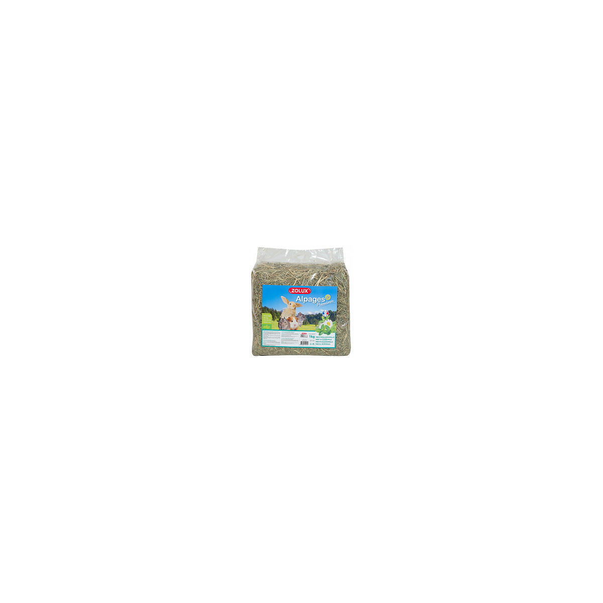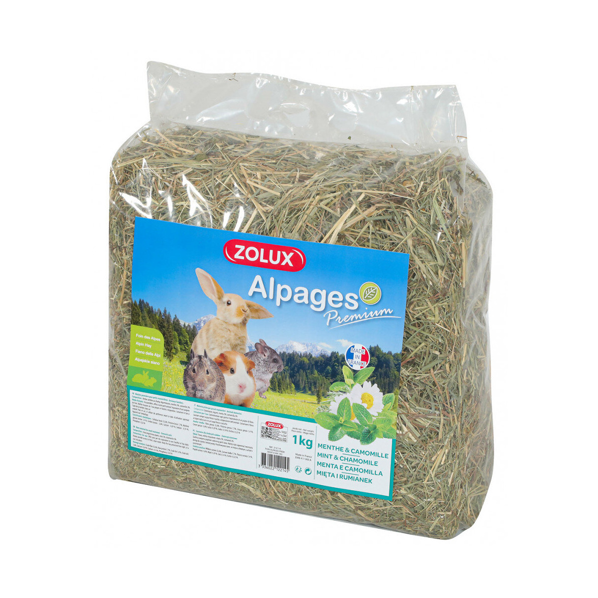 Foin alpage premium. menthe et camomille 1 kg. pour rongeur. Nouveau Foin premium aromatisé de première coupe récolté dans les Alpes. Ce foin a été sélectionné pour ses qualités nutritionnelles, aromatiques et sa grande appétence. Il contient des légumineuses, de la menthe 2% et de la camomille 2%. Mode d'emploi : au quotidien, offrez à votre petit animal l'équivalent d'une petite poignée de foin. Mettre toujours de l'eau propre et fraîche à disposition. Conserver le foin à l'abri de la lumière, dans un endroit frais et sec. A utiliser avant la date d'utilisation optimale figurant sur l'emballage. made in France Foin alpage premium. menthe et camomille. 1 kg. pour rongeur. Nouveau Foin premium aromatisé de première coupe récolté dans les Alpes. Ce foin a été sélectionné pour ses qualités nutritionnelles, aromatiques et sa grande appétence. Il contient des légumineuses, de la menthe 2% et de la camomille 2%. Mode d'emploi : au quotidien, offrez à votre petit animal l'équivalent d'une petite poignée de foin. Mettre toujours de l'eau propre et fraîche à disposition. Conserver le foin à l'abri de la lumière, dans un endroit frais et sec. A utiliser avant la date d'utilisation optimale figurant sur l'emballage. Composition : Herbes séchées au champ, légumineuses, menthe 2%, camomille 2%. Constituants analytiques : Cellulose brute 32,7 %, Protéine brute 7,7 %, Matière grasses brutes 1,4 %, Cendres brutes 5,6 %, Calcium 0,29 %, Sodium 0,14 %, Phosphore 0,23 %. made in France Photo non contractuelle, car il y a plusieurs vendeurs sur une même fiche produit.