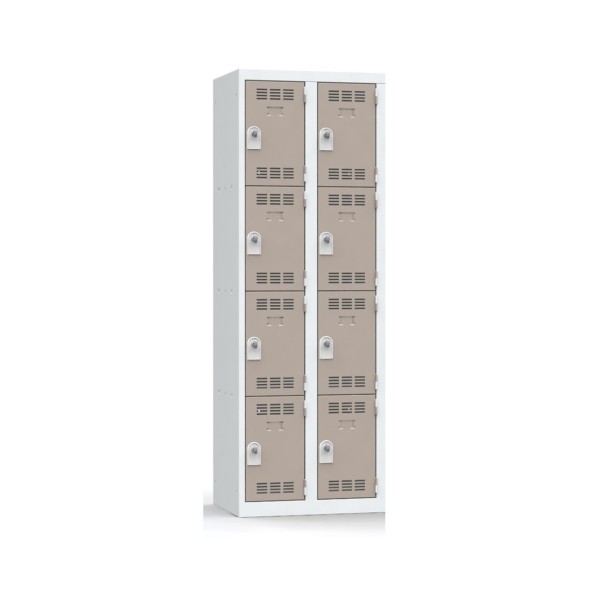 Vestiaire monobloc en acier XC recyclable d'épaisseur 7/10ème – 2 colonnes de 4 cases superposées - Système de fermeture par porte cadenas à moraillon débraillable - Porte étiquette embouti sur la porte - Dimensions : p50xL60xh180 cm - Finition peinture poudre d'epoxy - Coloris : corps gris perle et portes taupesSpécifications techniques