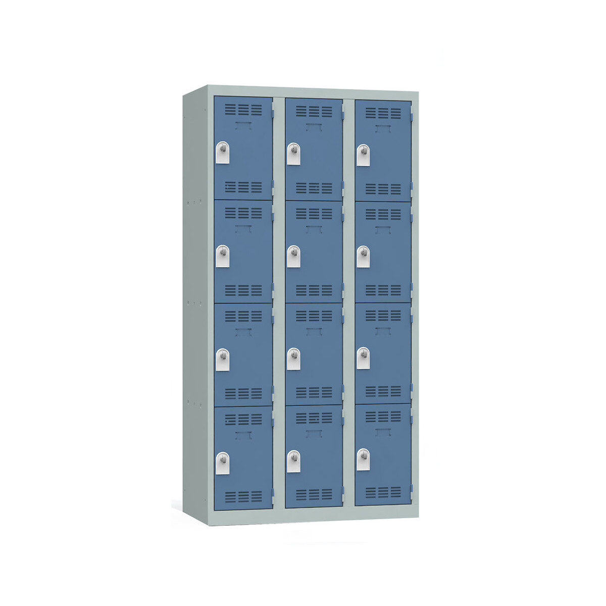 Vestiaire monobloc en acier XC recyclable d'épaisseur 7/10ème – 3 colonnes de 4 cases superposées - Système de fermeture par serrures à clef livrées chacune avec un jeu de 2 clefs - Porte étiquette embouti sur la porte - Dimensions : p50xL120xh180 cm - Finition peinture poudre d'epoxy - Coloris : corps gris perle et portes bleuesSpécifications techniques
