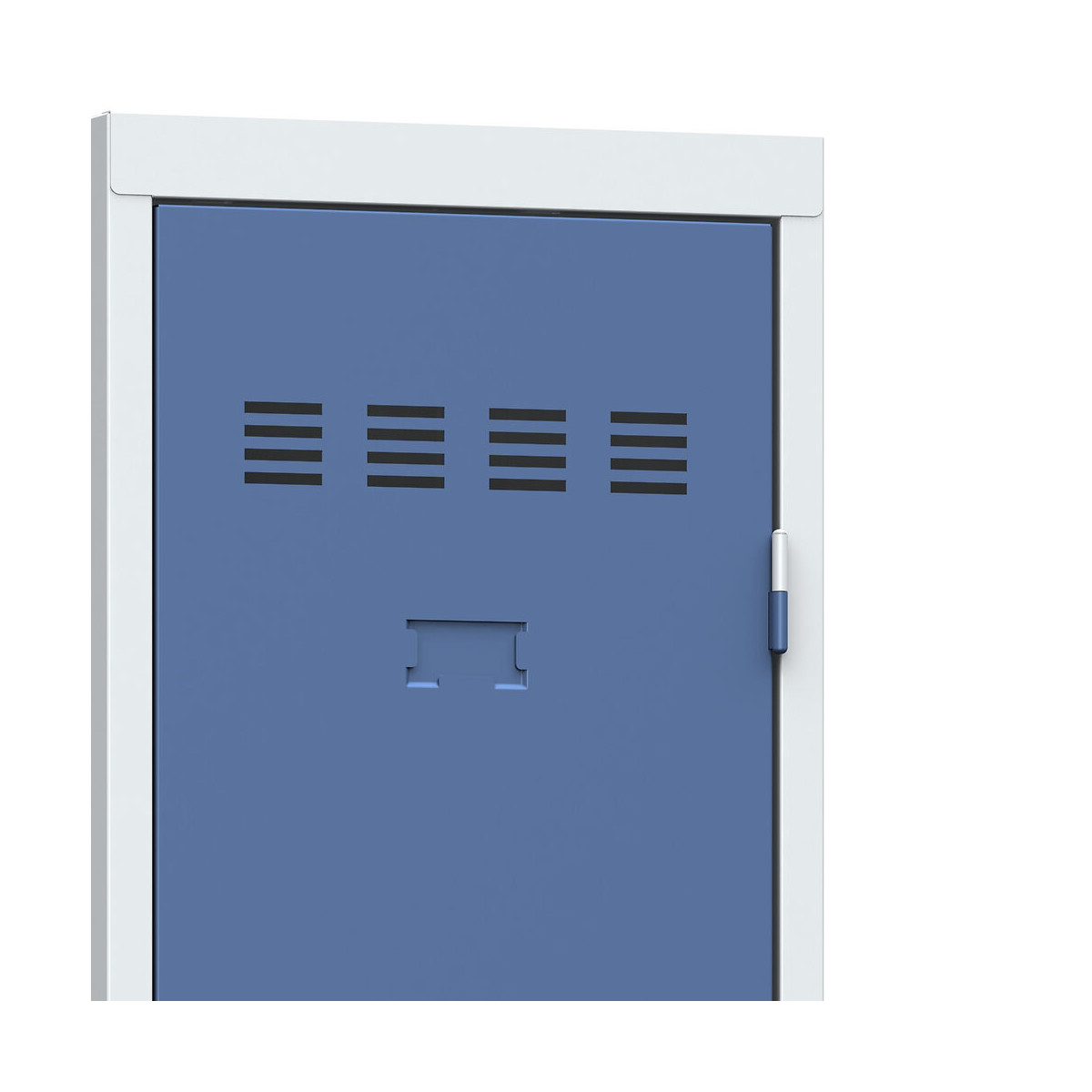 Vestiaire monobloc en acier XC recyclable d'épaisseur 7/10ème – 1 colonne de 4 cases superposées - Système de fermeture par serrures à clef livrées chacune avec un jeu de 2 clefs - Porte étiquette embouti sur la porte - Dimensions : p50xL40xh180 cm - Finition peinture poudre d'epoxy - Coloris : corps gris perle et portes bleuesSpécifications techniques