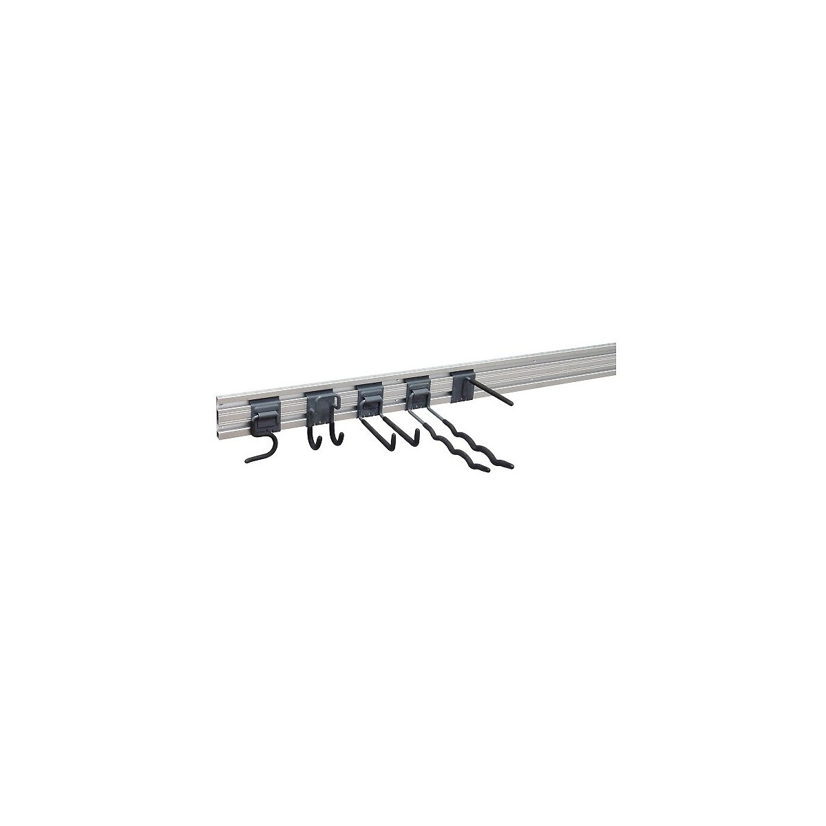 Composé d’un profilé aluminium rainuré de longueur 1,20 m et de 5 crochets : - 1 triple crochet 30 mm. - 1 crochet rond 40 mm spécial manches longs. - 1 double crochet droit 150 mm. - 1 crochet droit 170 mm. - 1 double crochet ondulé 300 mm.